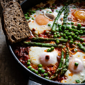 HUEVOS EN CAZUELA, ovvero “UOVA CON CHORIZO, PROSCIUTTO, PEPERONI, ASPARAGI E PISELLI” Un comfort food genuino e molto gustoso, perfetto da condividere. Da “La cocina Vasca” di Maria Josè Sevilla,…
