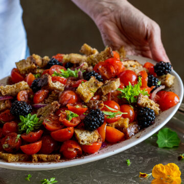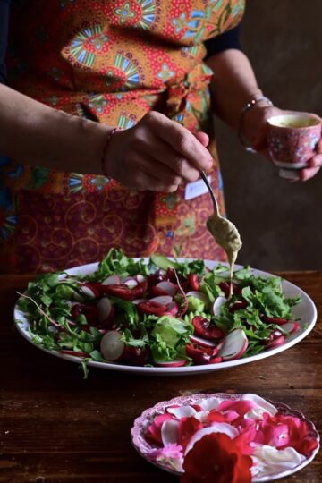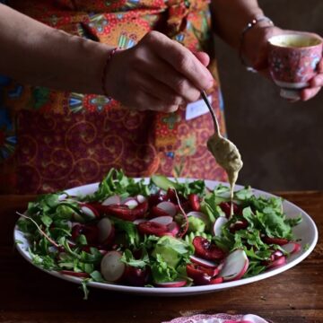 Una tavolozza di colori, freschezza e profumi! Un’insalata che sa d’estate: cetrioli croccanti, ravanelli, rucola, petali di rosa e ciliegie. Il tocco in più? Una vinagrette aromatica con senape e…