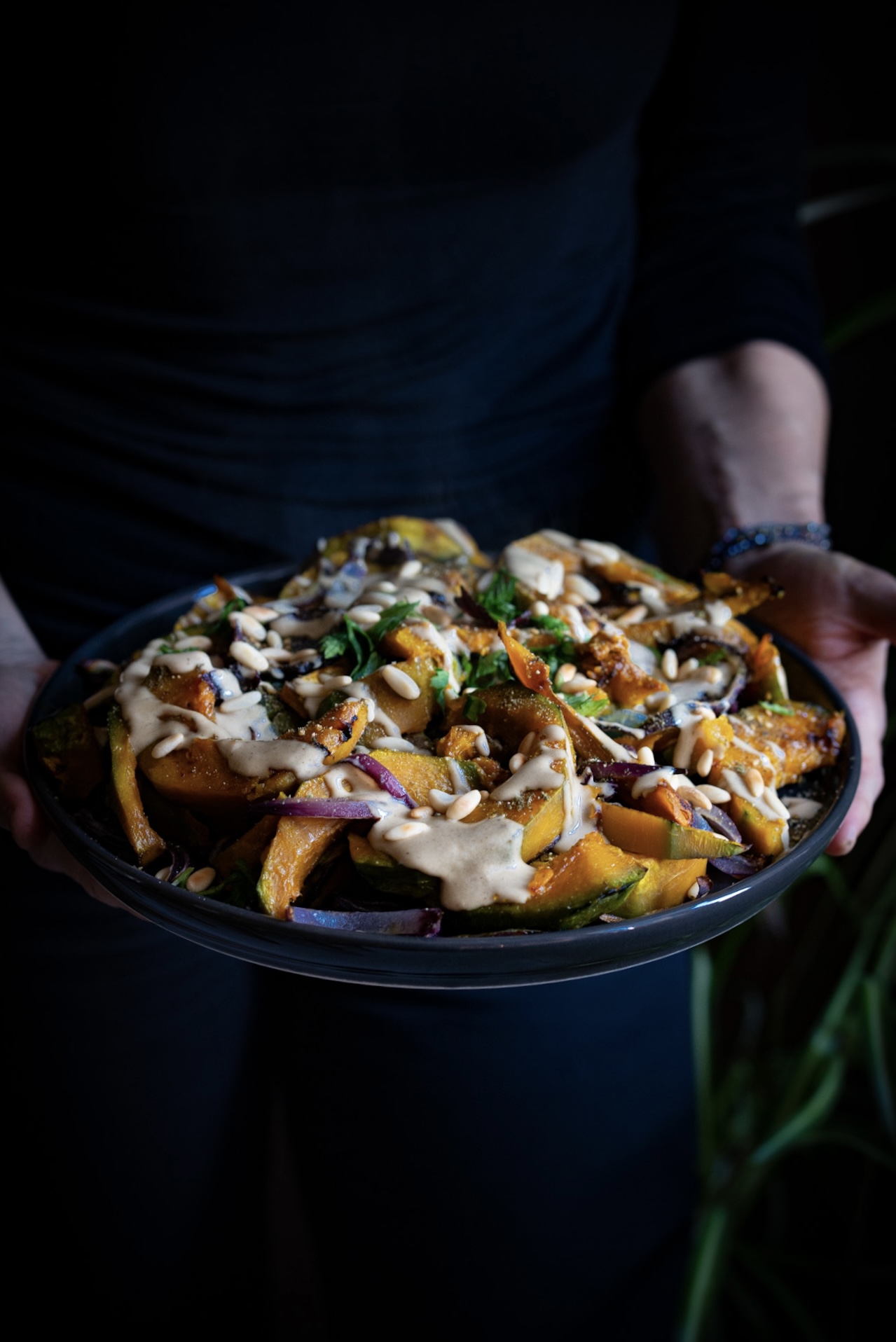 Zucca con cipolle rosse al forno, tahini e za’atar