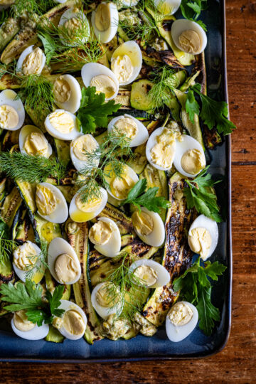 Zucchine grigliate con uova di quaglia e salsa tartara