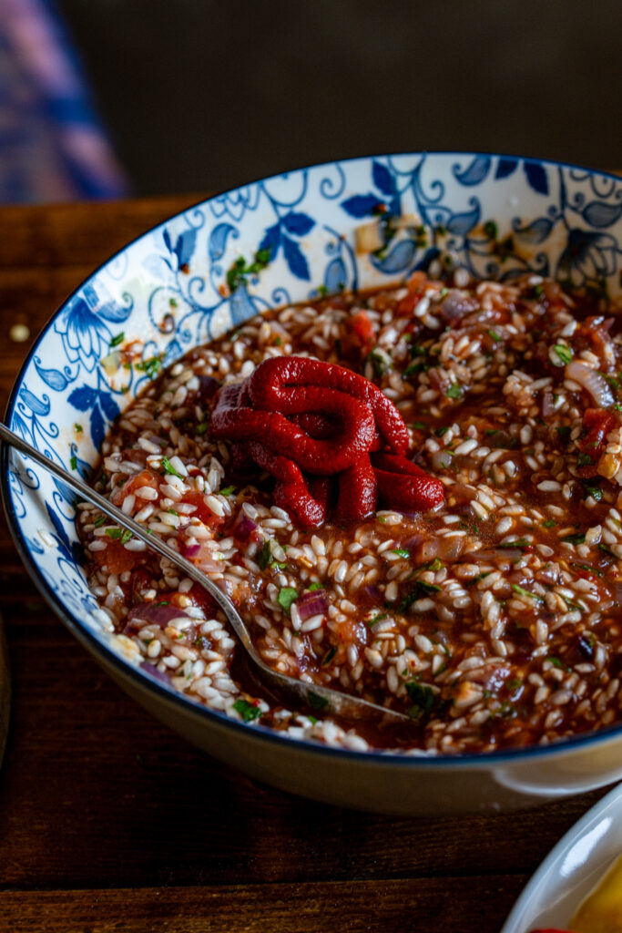 Trasferiscile in una ciotola e unisci il pomodoro grattugiato, 2 cucchiai di concentrato di pomodoro, il cumino, pepe macinato, prezzemolo, melassa di melograno, pul biber e buccia di limone a piacere. Assaggia e aggiusta di sale.