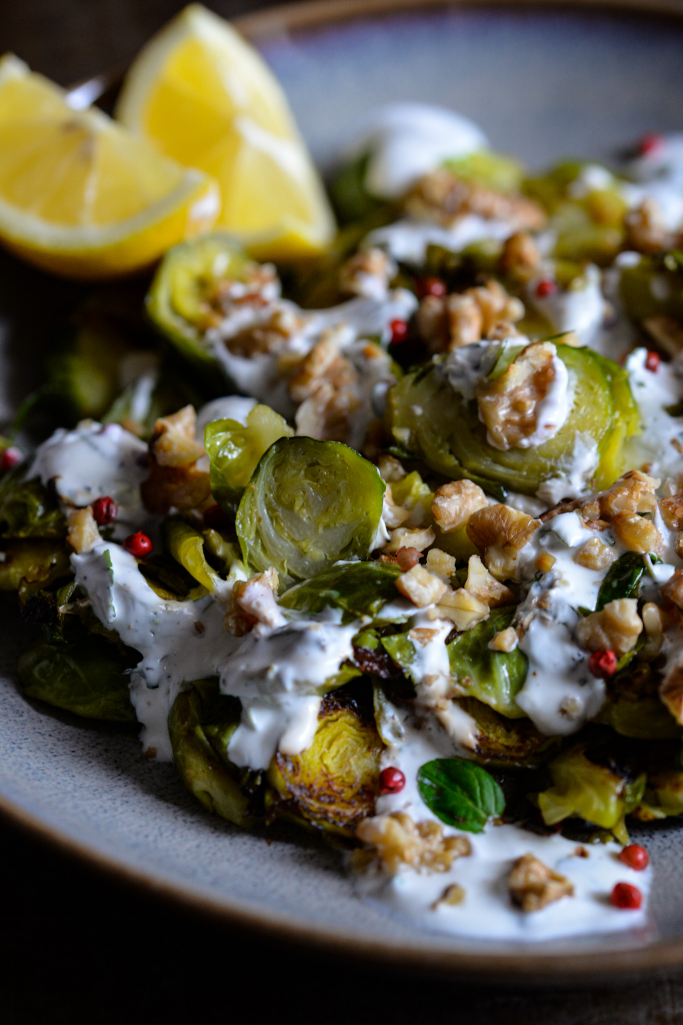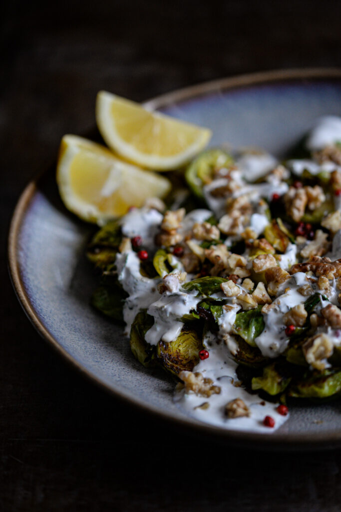 Insalata di cavolini di Bruxelles con noci e salsa alla menta.