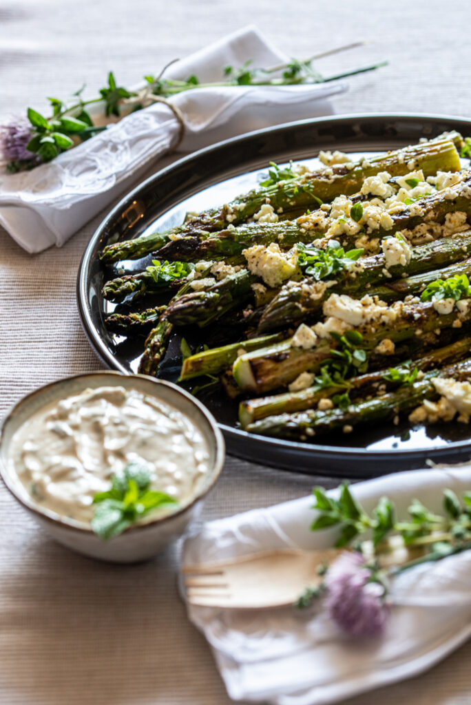 Piatti semplici ma gustosi: ho preso un mazzo di asparagi e li ho grigliati su una piastra molto calda. Intanto ho preparato un’emulsione a base di olio, succo di limone e gomasio (ma va benissimo anche il sesamo tostato) con la quale ho condito gli asparagi cotti. Ho aggiunto un po’ di feta sbriciolata e una macinata di pepe.
