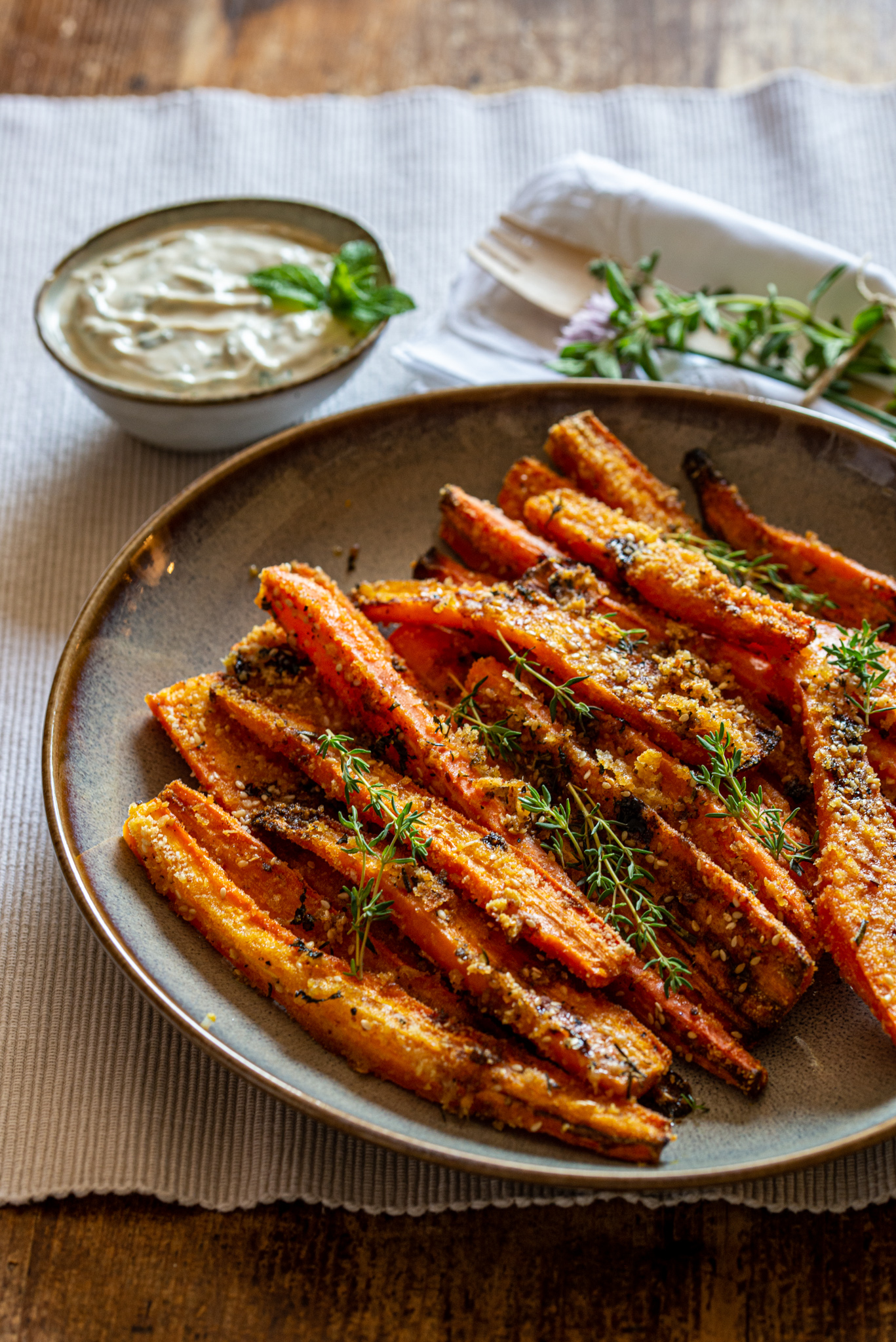 Ho preso delle carote, le ho sbucciate e tagliate a metà per il lungo, le ho disposte su una teglia ricoperta di carta forno e le ho irrorate con un filo di olio. Poi le ho cosparse con pangrattato e parmigiano, un trito di erbe aromatiche tra cui timo e basilico, sale, pepe e ho infornato finché si sono leggermente gratinate. A fine cottura ho spruzzato qualche goccia di aceto balsamico.