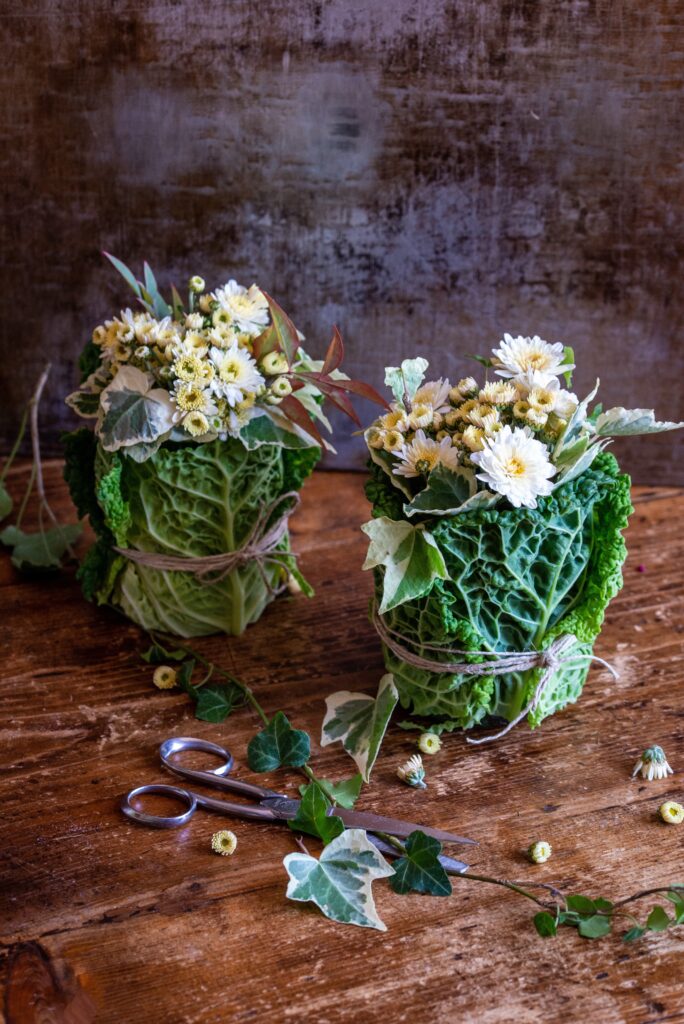 Facciamolo insieme! Ci serviranno: Vasetto di vetro Foglie di cavolo verza Crisantemi piccoli o altri fiori Rametti di edera Spago color corda