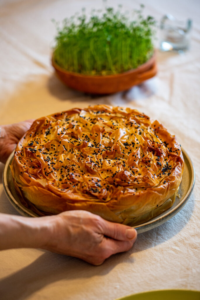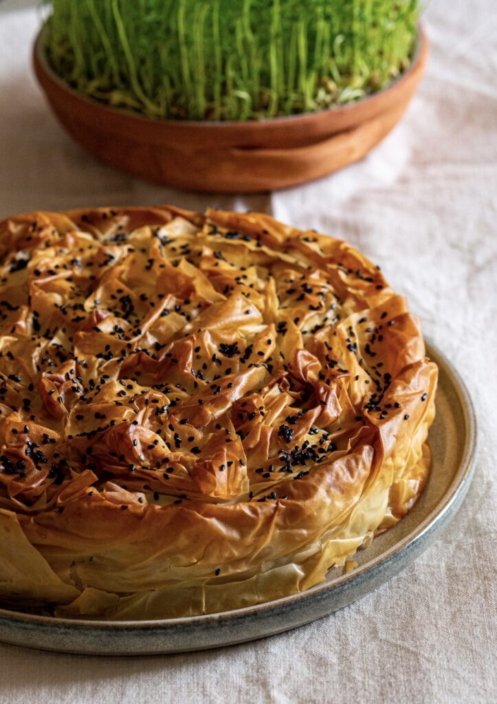 Spennellare 4/5 fogli di fillo con il burro e stropicciarli, adagiarli sulla pie e ripiegare verso l’interno tutti i lembi di pasta fillo che sbordano sui lati stropicciandoli leggermente per creare un piacevole effetto arruffato. Spennellare con il burro/olio rimasto, cospargere con i semi di nigella e infornare.