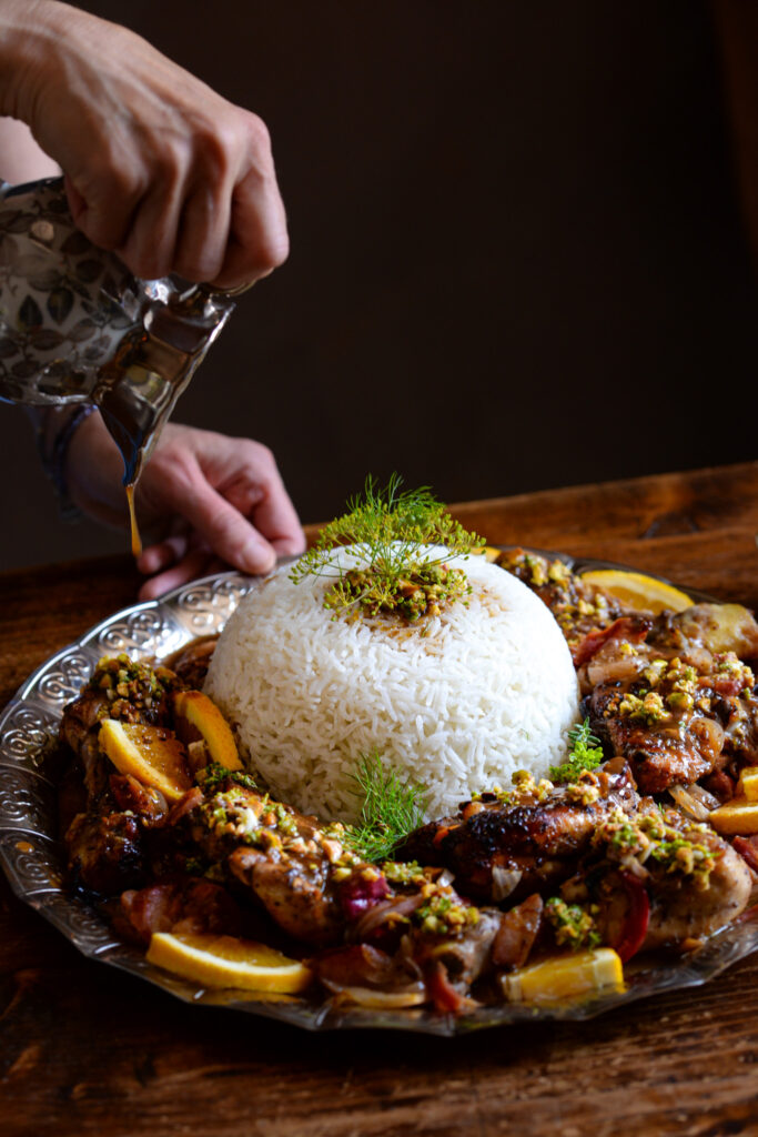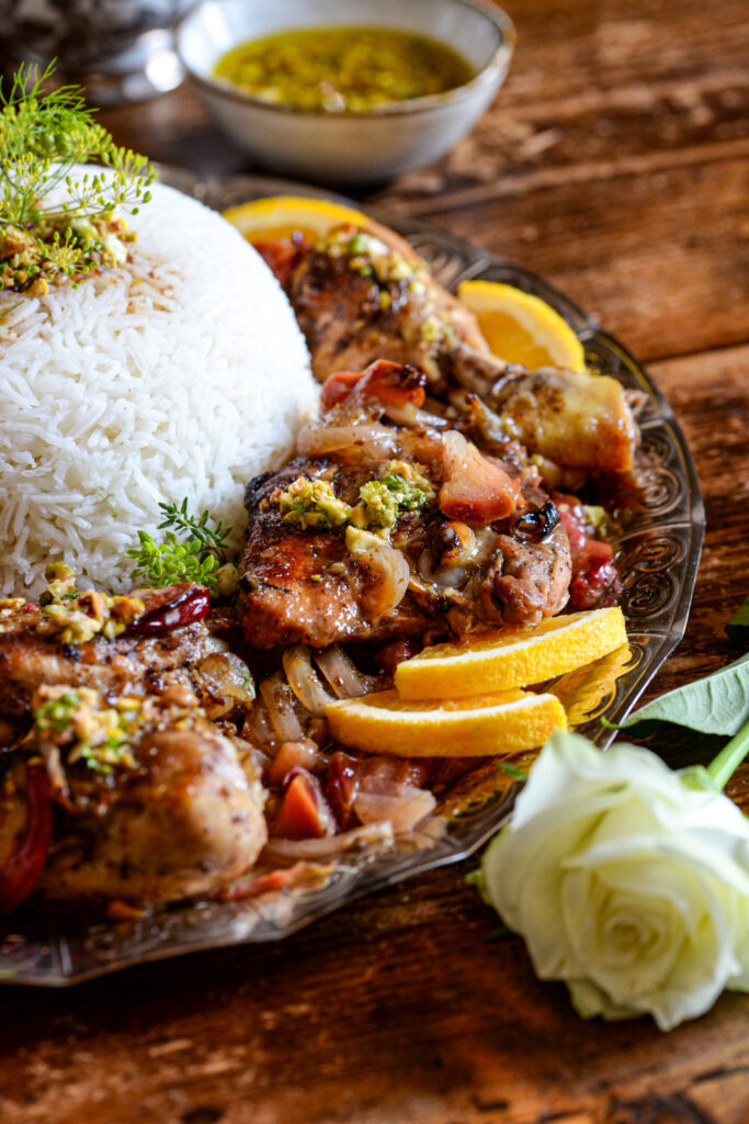 Per il condimento: schiacciate il pistacchio in un mortaio con l’aglio ed un po’ di sale. Aggiungete il coriandolo fino ad ottenere una pasta, quindi mescolate l’olio ed il succo di limone. Aggiustate con sale e pepe e con un cucchiaio distribuitelo sul pollo.