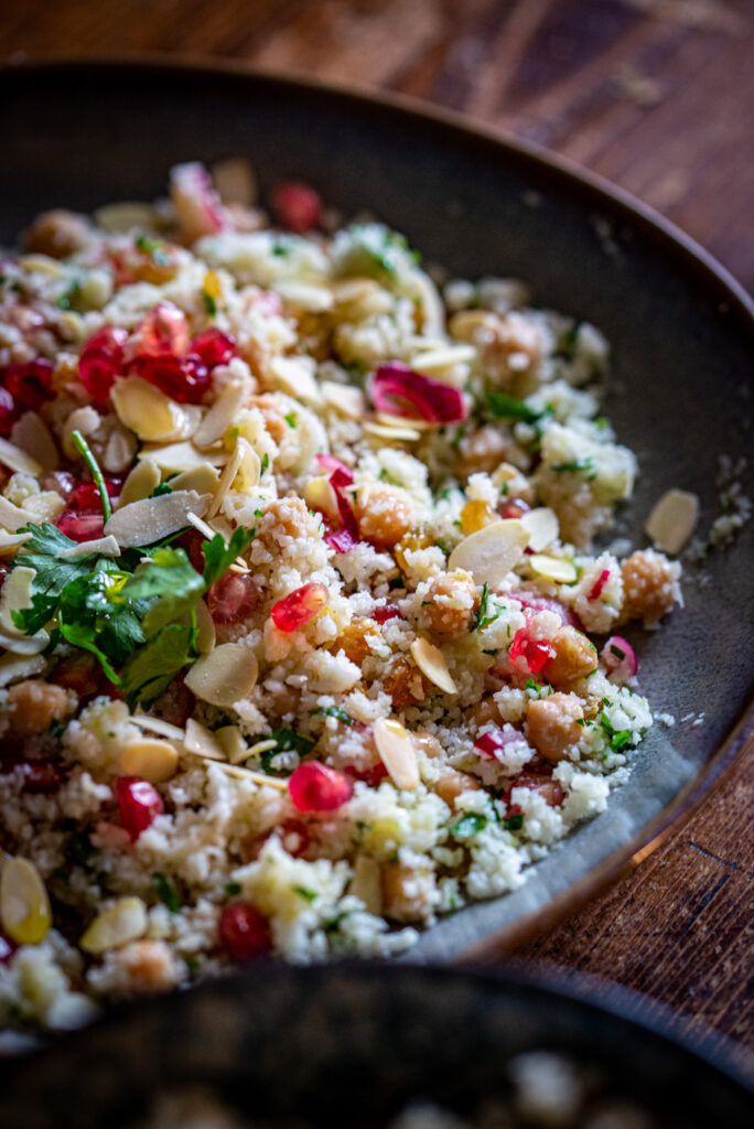 Cous cous di cavolfiore: immaginate un piatto che assomiglia al cous cous ma ha le stesse calorie della verdura, un piatto unico perfetto per riprendere le sane abitudini dopo le abbuffate del Natale… Cous cous di cavolfiore, ceci, uvetta e melagrana.