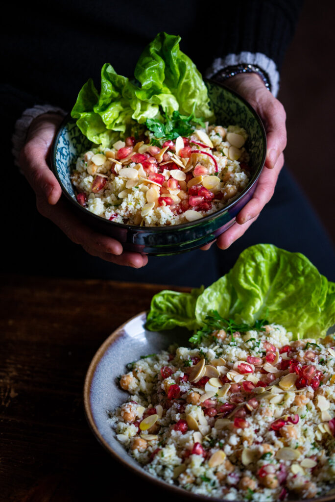 Poi le ho scolate e le ho messe nella ciotola dove ho versato il cous cous di cavolfiore già cotto, 250 gr di ceci già lessati, chicchi di melagrana, mandorle a lamelle leggermente tostate, la scorza e il succo di un lime, qualche rametto di prezzemolo e menta tritati. Ho condito con olio extravergine di oliva e ho mescolato nel cous cous tanti pensieri allegri… e poi ho servito con foglie di lattuga croccanti