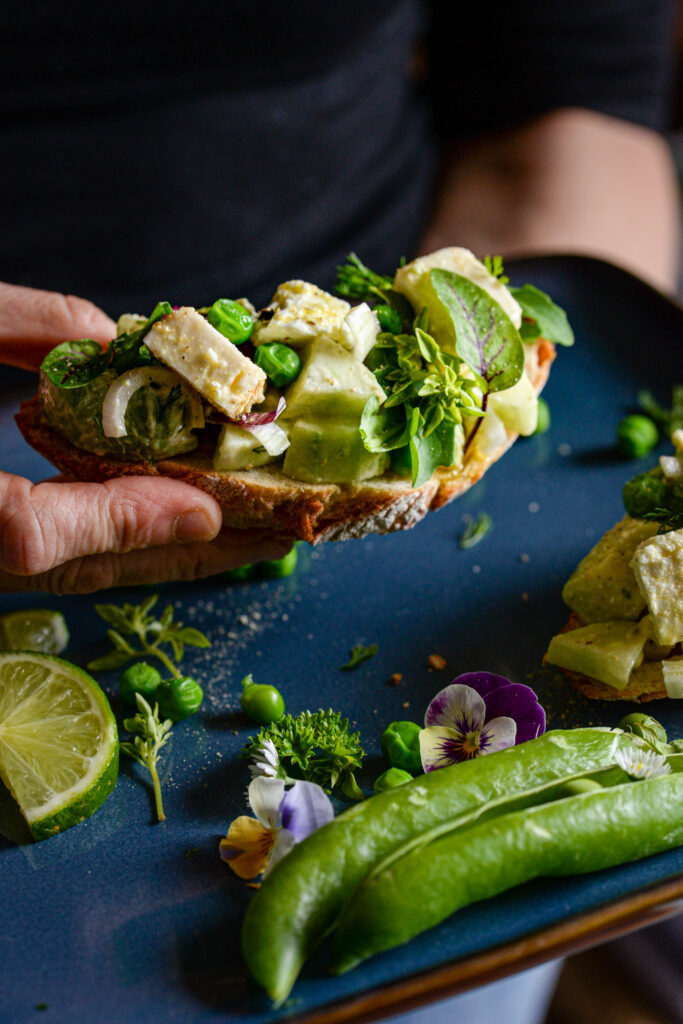Giugno: stagione di pranzi freschi e veloci. Cosa c’è di meglio di un Crostino con insalata di avocado, cetrioli e feta marinata?