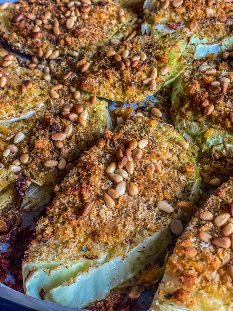 Tagliare il cavolo a fette alte circa 1 cm, metterle su una teglia ricoperta di carta da forno, spennellarle di olio extravergine e sale. Tritare in un mixer i panini, le acciughe, l’aglio e i pomodori secchi fino ad ottenere delle briciole soffici e grossolane. Cospargere le briciole sul cavolo insieme al parmigiano grattugiato. Versare anche l’organo, il pepe e i pinoli, irrorare con altro olio e infornare a 180 gradi per 20 min circa. Dovrà diventare di un bel colore dorato.