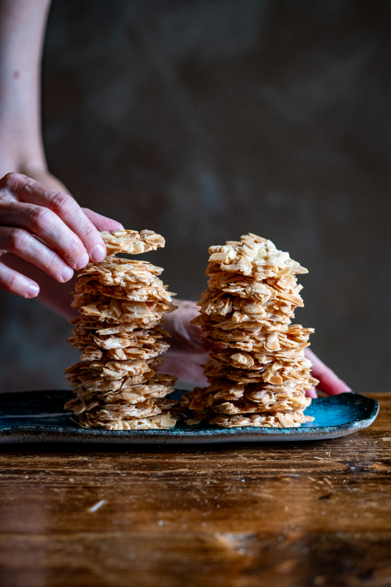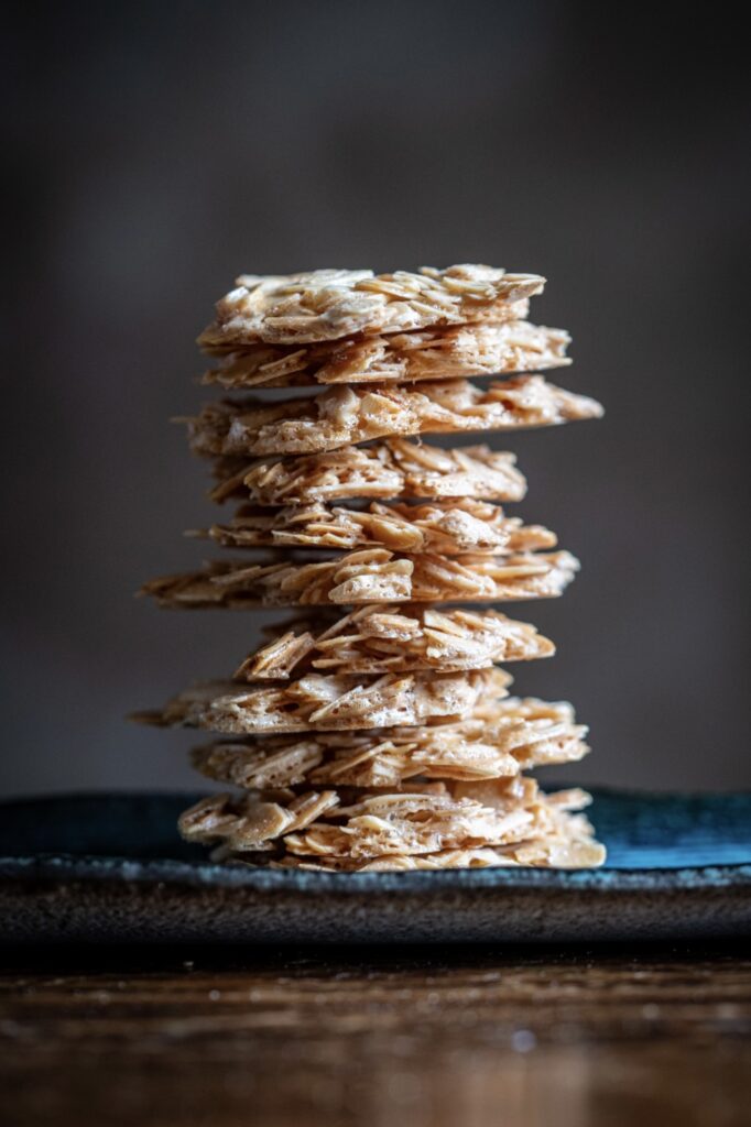 Cerca di renderli il più sottili possibile senza creare troppi spazi tra le fette di mandorle. Dovrebbero essere circa 8 cm di diametro.