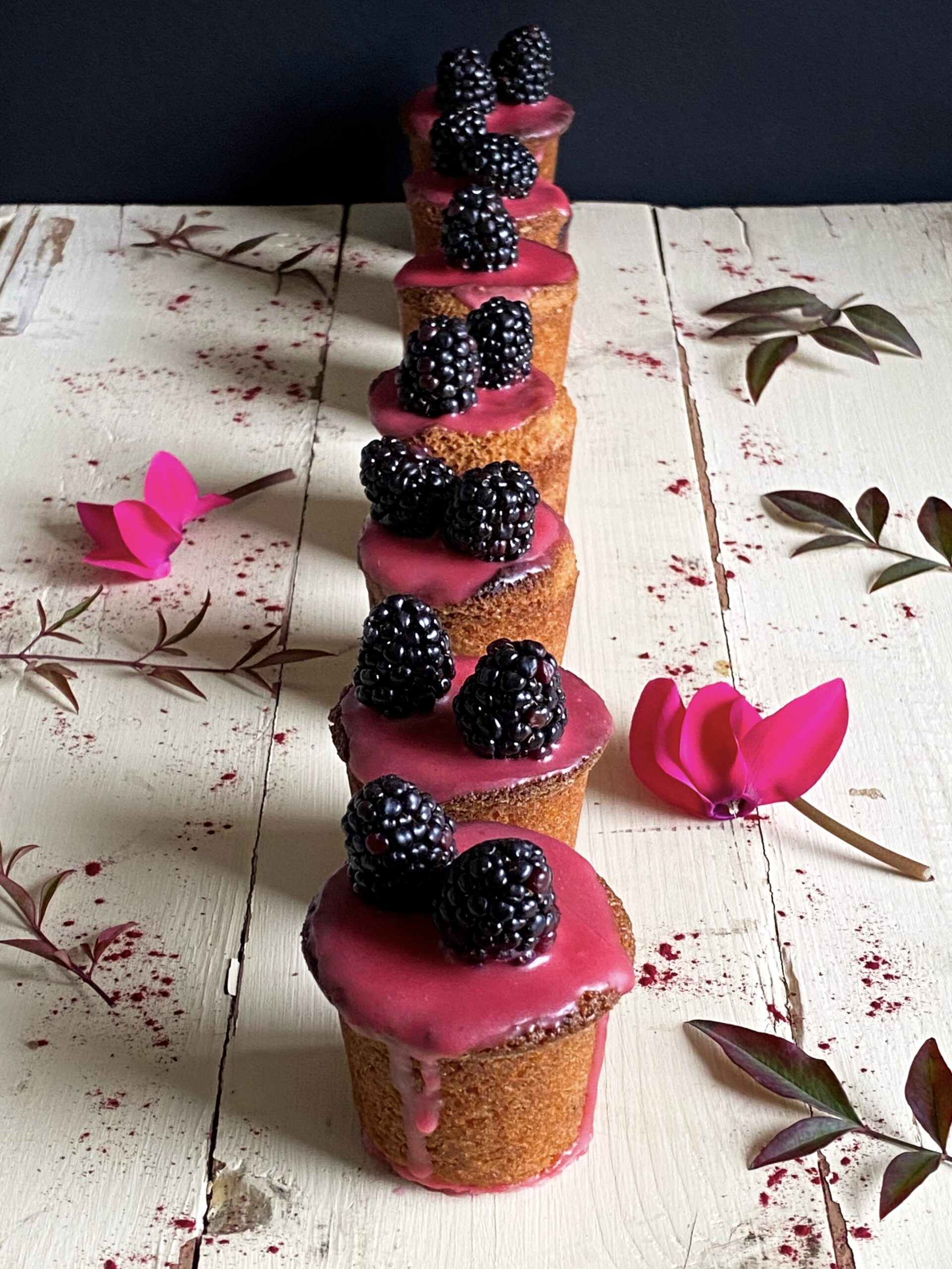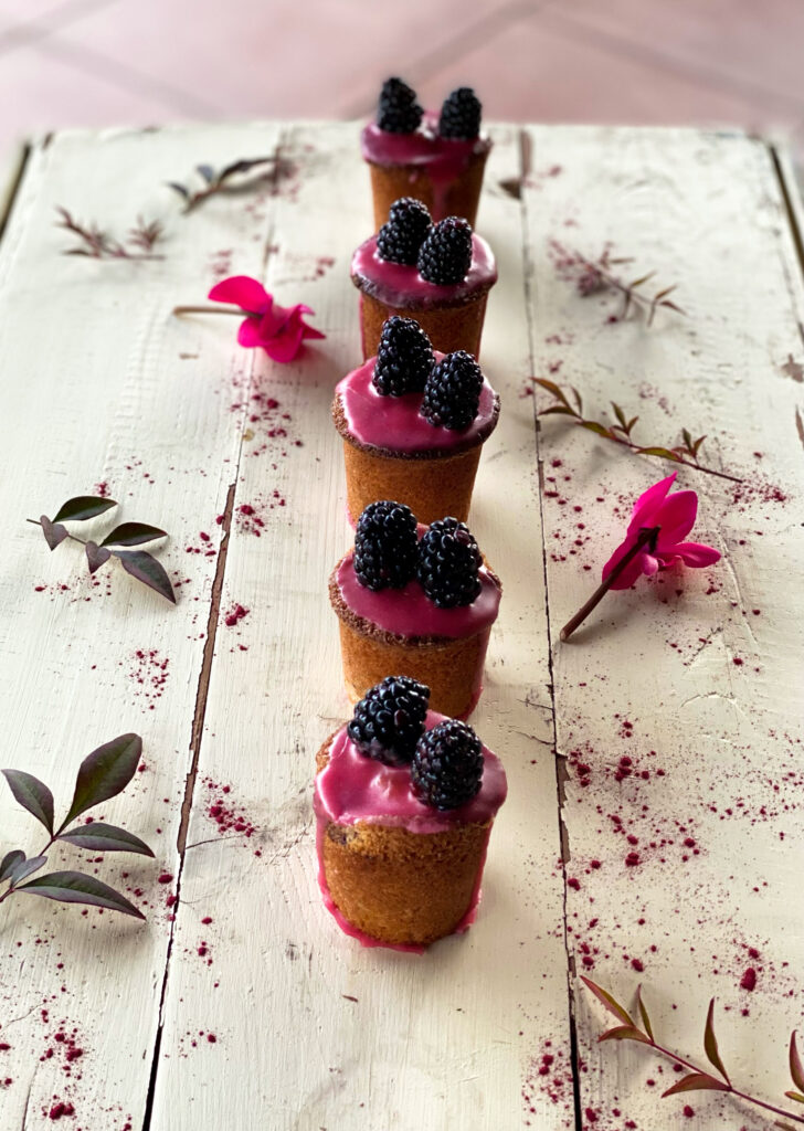 Per la glassa: mettete 60 g di more in una ciotolina con l’acqua e il succo di limone. Schiacciatele con una forchetta, passatele poi in un colino a maglia fine per ottenere 60 ml di succo. Versate sullo zucchero a velo setacciato, mescolando fino a ottenere una glassa quasi liquida. Ponete le tortine su una griglia e spalmatele di glassa con un cucchiaio fin sui bordi, lasciando che sgoccioli lungo i lati. Mettete una mora su ciascuna friand, fate risposare per 20 minuti e servite.