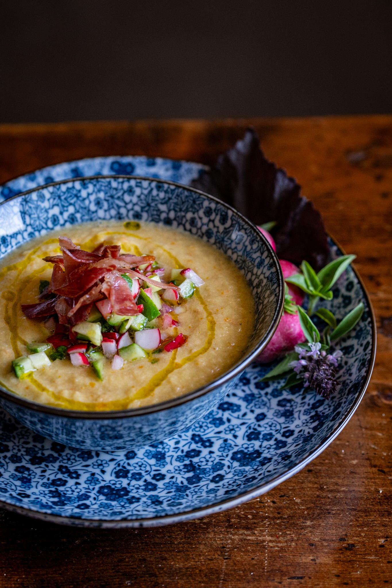 Quando siete pronti per servire scaldate l’olio in una padella e friggete il prosciutto finché non diventa croccante. Dividete la zuppa in quattro ciotole. Mettete l’insalata tritata al centro di ogni ciotola, aggiungete il prosciutto croccante e condite con qualche fiocco di sale, olio extravergine di oliva e altro succo di limone se pensate che ne abbia bisogno. Servite con pane croccante.