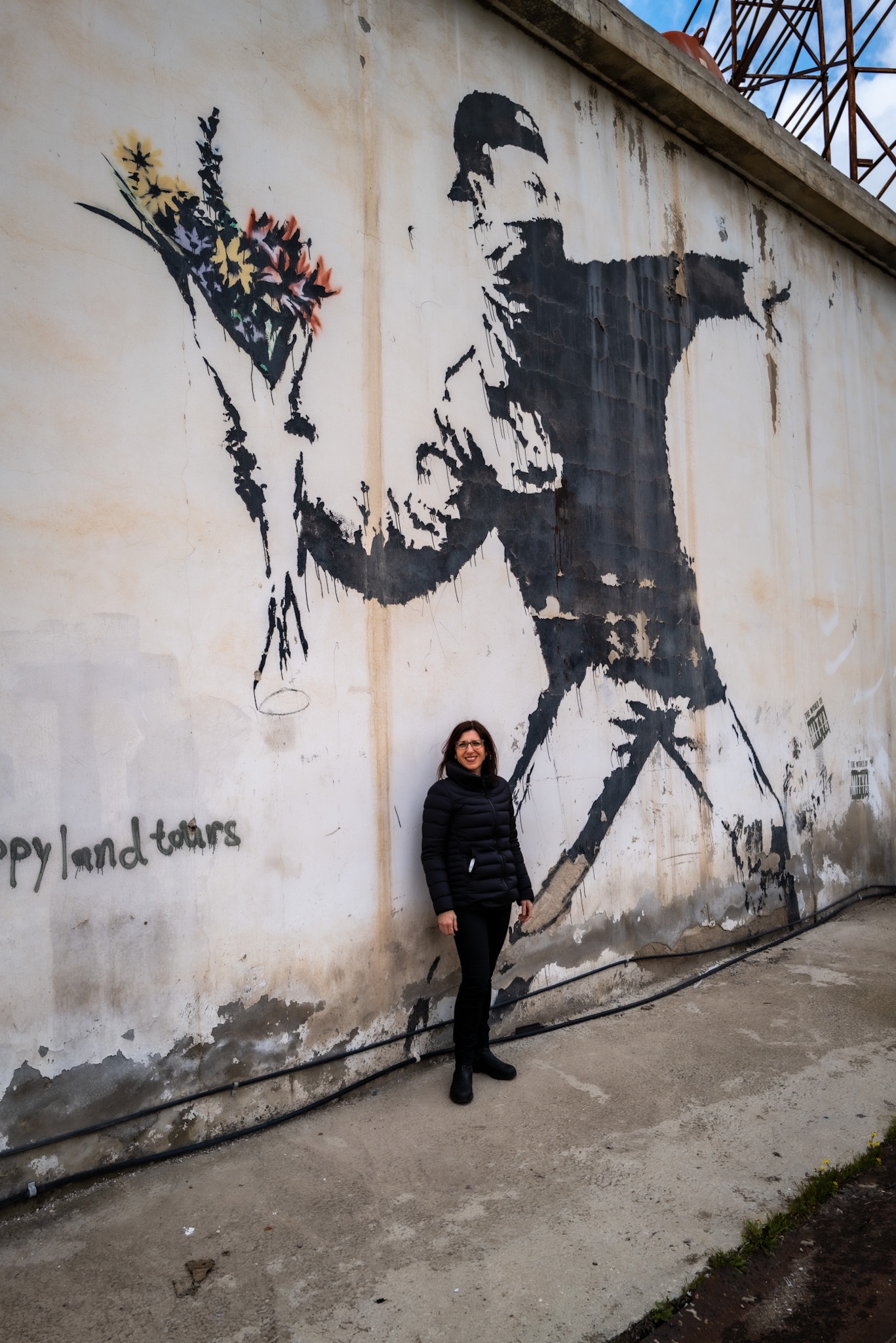 A Betlemme ho visto una delle pitture su parete più famosa di Bansky. Questo graffito non si trova sul muro di Betlemme, ma sul muro dietro a un benzinaio. Raffigura un giovane ragazzo che tira un mazzo di fiori al posto di una bomba molotov. Ha una bandana sul viso e si affida al potere dei fiori, unico elemento colorato della rappresentazione.