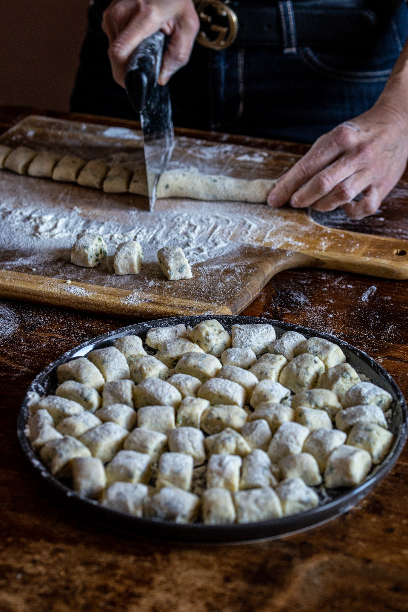 Si impastano tutti gli ingredienti, si formano dei filoncini, si tagliano gli gnocchi e si cuociono in acqua bollente salata finché non vengono a galla.