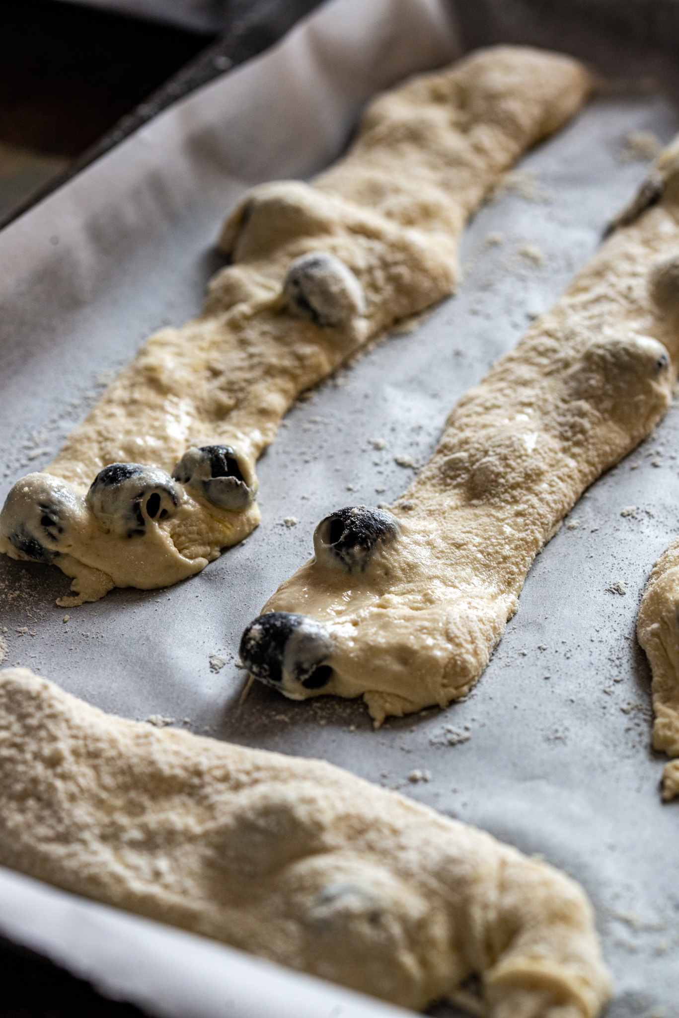 Essendo molto idratato sarà piuttosto difficile da gestire. Tagliare dei bastoncini, passarli nella farina e allungarli leggermente su una teglia ricoperta di carta da forno. Cuocere a 180 gradi finché non diventano dorati.