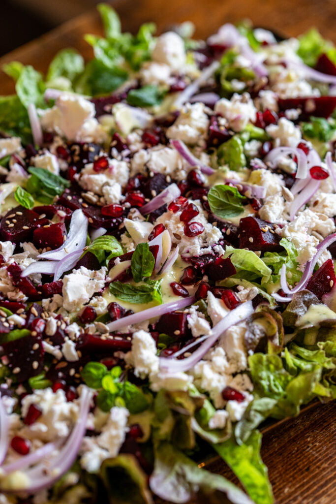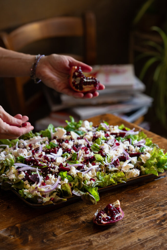 Comporre il piatto mettendo sul fondo un letto di insalata, la barbabietola tagliata a piccoli pezzi, la feta sbriciolata, la cipolla a fette, le foglie di menta spezzettate, i chicchi di melagrana e i semi misti tostati. Macinare del pepe fresco e condire con il dressing al mohito