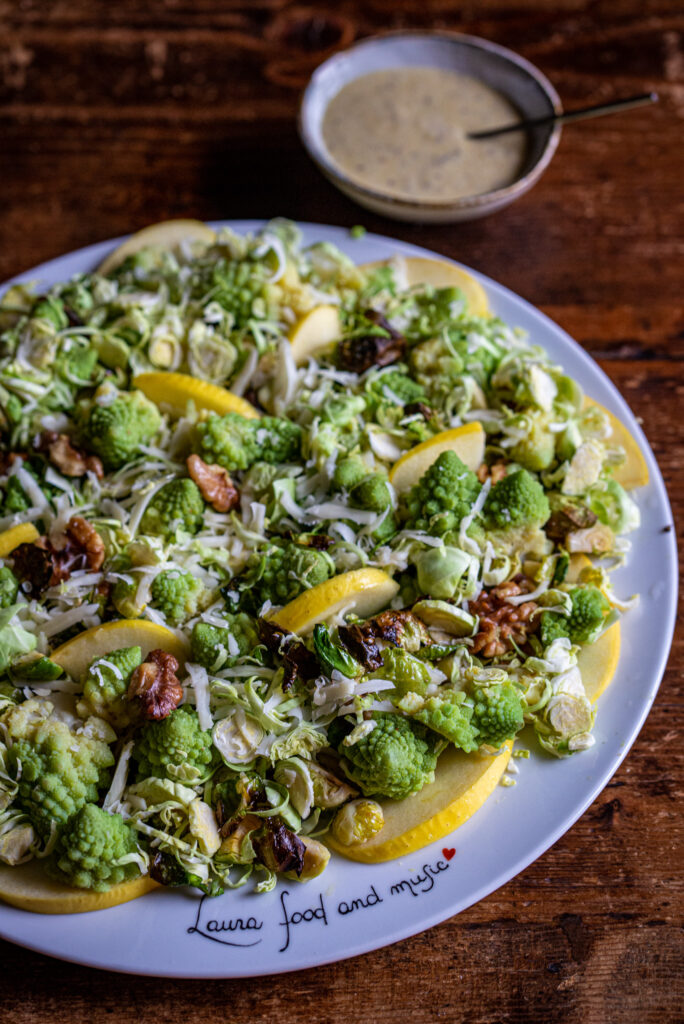 Preparare la salsa frullando tutti gli ingredienti. Comporre il piatto alternando le foglie dei cavoletti con le noci al forno, i cavoletti crudi, il broccolo romano e le fettine di mela o pera. Finire il piatto con scaglie di pecorino e condire con la salsa.