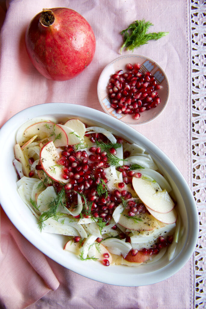 Lavate i finocchi e affettateli sottilmente. Condite con metà succo di limone per evitare che anneriscano. Lavate le mele e rimuovete torsolo e semi, affettatele sottilmente. Versare le fette nella terrina insieme all’aneto tritato, i semi di melagrana, il restante succo di limone e l’olio. Salare e pepare a piacere.