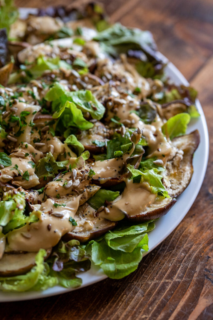 Componi il piatto. Guarnisci il piatto di lattughe con le melanzane arrostite, versa sopra il condimento e completa con una manciata di semi tostati.