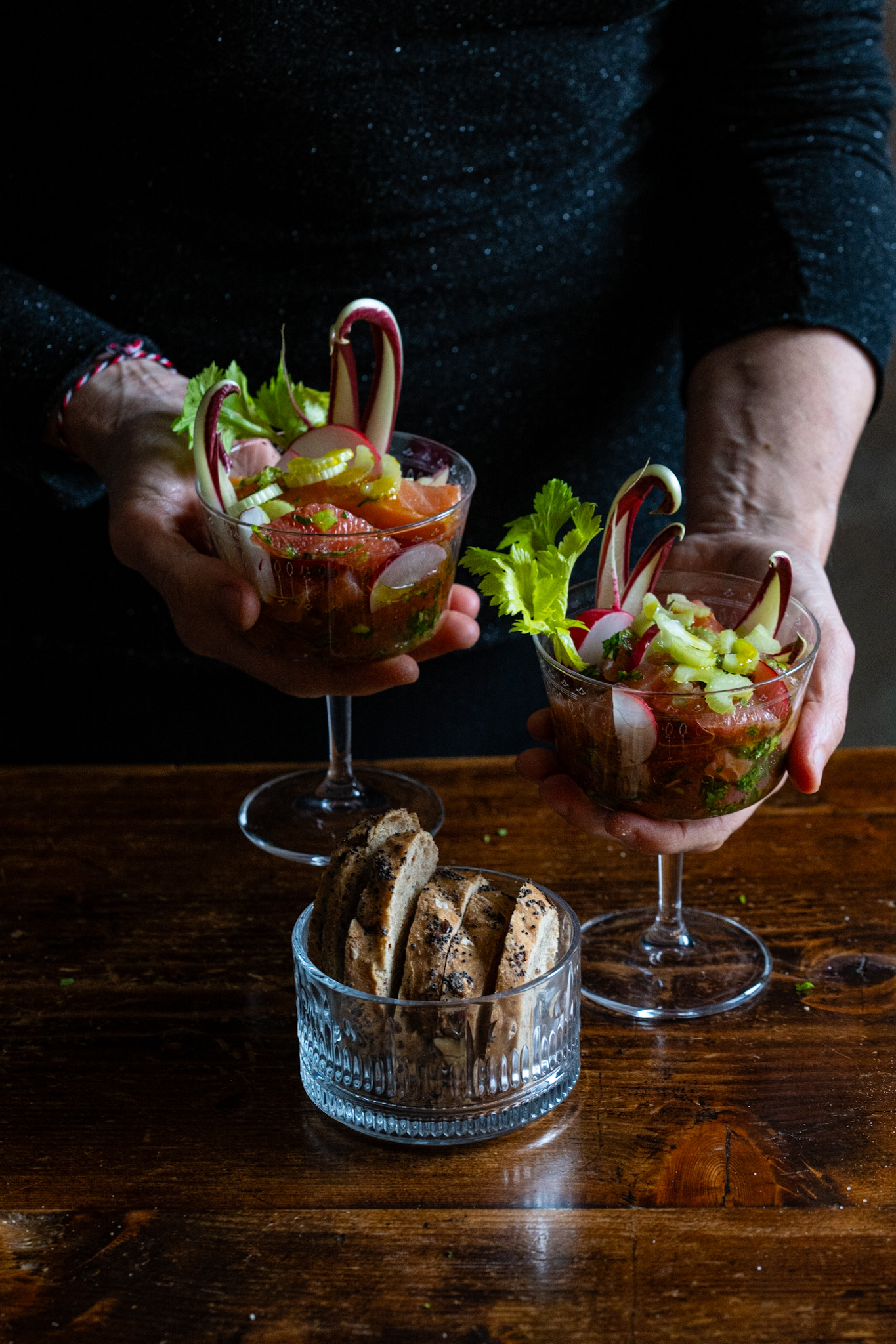 Ho messo sul fondo un po di insalata di pompelmo e poi ho aggiunto delle fettine di salmone. Uno strato di pompelmo e per finire un altro di salmone…manca solo qualche foglia di insalatina croccante e colorata. Ci stanno benissimo il sedano, radicchio e ravanelli. Un filo d’olio , e qualche crostino tiepido che fa sempre scena.