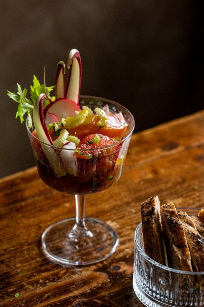 Cercavo da giorni un abbinamento per il salmone affumicato. Ho scelto due bei pompelmi rosa, li ho pelati al vivo (un po’ come si fa con le arance) e ho ricavato tante fettine succose, che ho messo in una ciotola. Ho grattugiato la buccia di un lime. E poi ho aggiunto erba cipollina, prezzemolo e qualche foglia di sedano, le ho tritate e le ho unite all’insalata di pompelmo. Un po’ di olio, sale e pepe, e ho mescolato tutto.