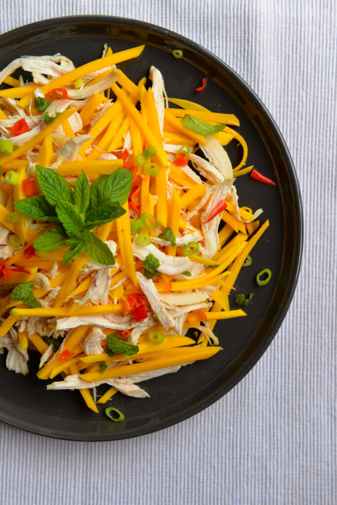 Inizia a preparare l’insalata. Pelare il mango e affettarlo sottilmente a julienne. In una terrina, unire i mango, il pollo, la menta e i cipollotti e un condimento dal quale avrete eliminato l’aglio. Condite con 2 cucchiai di olio extravergine di oliva e aggiustare di sale. Cospargete con rondelle di peperoncino e servire.