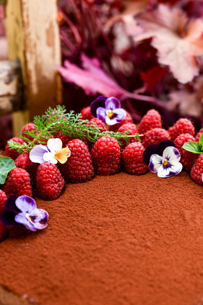 Io l’ho decorata con lamponi maturi, fiori di violetta e qualche rametto di achillea.