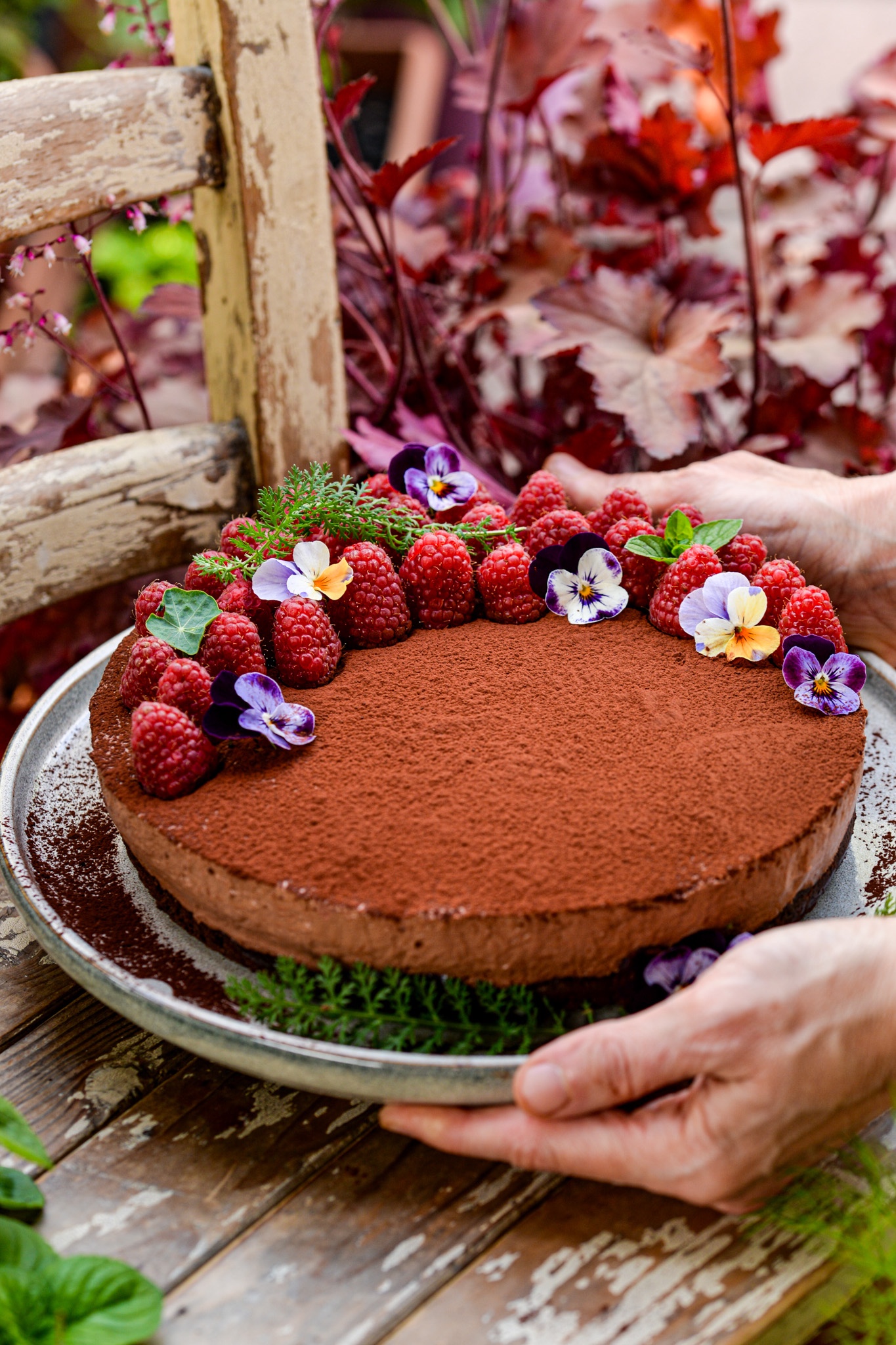 Io l’ho decorata con lamponi maturi, fiori di violetta e qualche rametto di achillea.