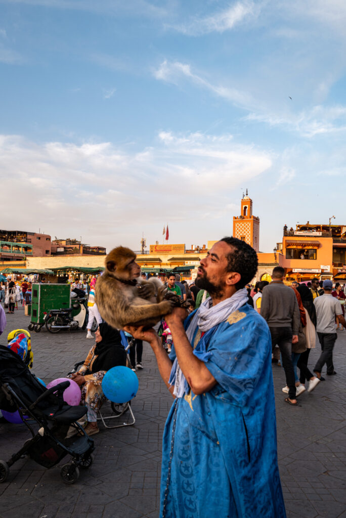 Jamaa el-Fna a Marrakech è una delle piazze più belle del mondo. La mattina assomiglia ad un circo, incantatori di serpenti che fanno ondeggiare cobra al suono di flauti e musicisti con i loro strumenti tipici che intrattengono i turisti in cambio di pochi dirham. Venditori di arance, ammaestratori di scimmie, donne tatuatrici che ti prendono le mani e cominciano a disegnare ghirigori con l’hennè. Prima di arrivare a Marrakech avevo sentito parlare molto di questa piazza, avevo osservato molte fotografie ma ho dovuto percorrerla più volte per capire quanto è grande perché davvero una foto non rende.