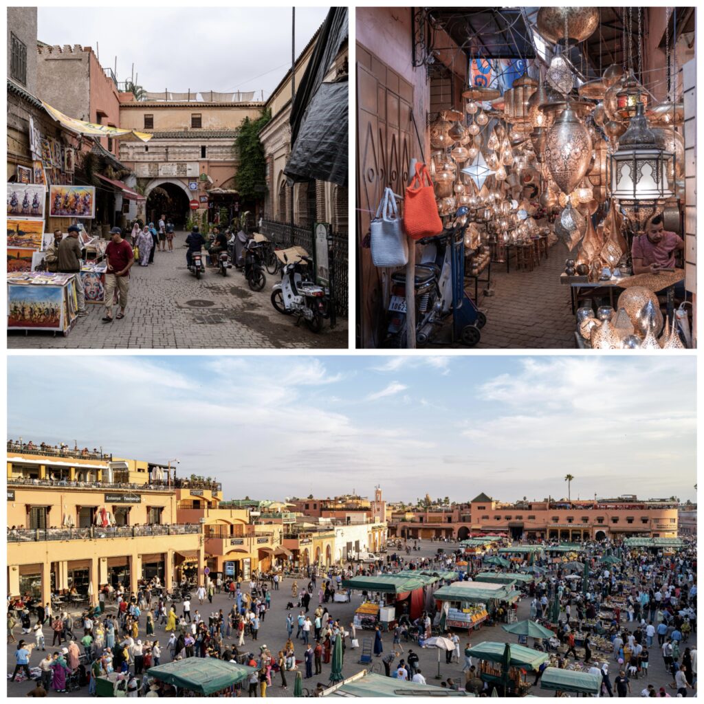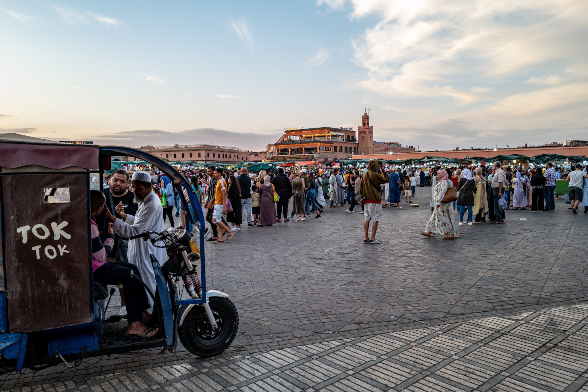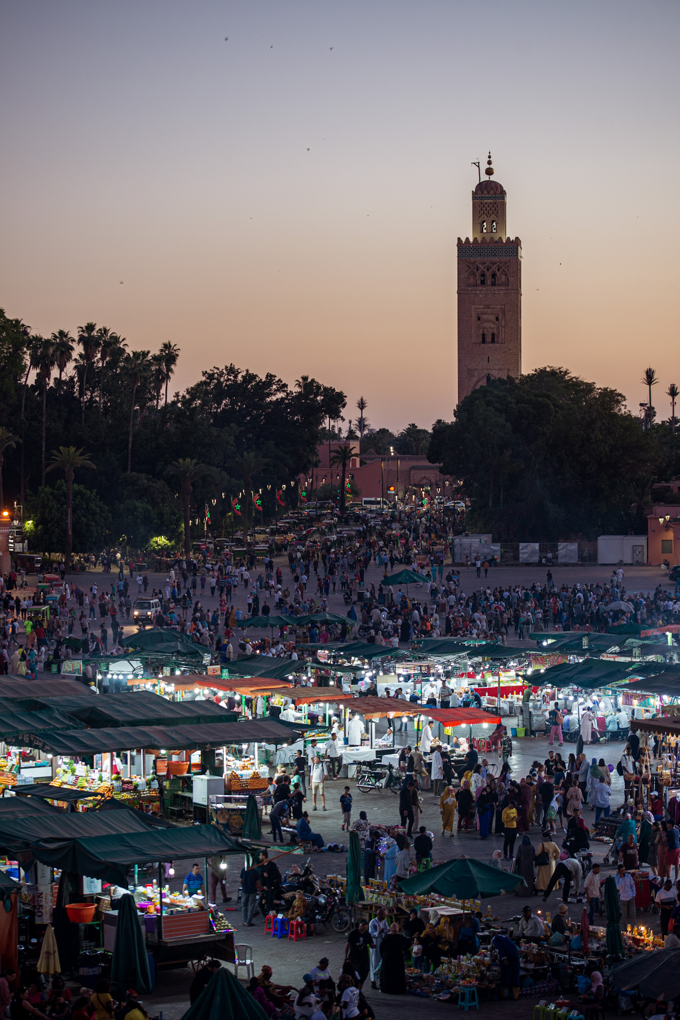 Quando il sole inizia a tramontare gli artisti di strada lasciano il posto a decine di bancarelle gastronomiche, ristoranti improvvisati sotto il cielo stellato dove i cuochi cucinano a vista. Il caos del mattino si trasforma quindi in sfrigolio di carni, rumore di pentole e i ristoratori ti chiamano nella tua lingua per convincerti a mangiare ai loro tavoli. La luce del giorno si affievolisce e mille lanterne si accendono, tra i fumi della griglia e aromi di carni alla brace. Puoi osservare la trasformazione di questa piazza da una delle tante terrazze che si affacciano dove puoi sorseggiare te alla menta marocchino o mangiare e goderti la magia di questo spettacolo vivente che si ripete uguale ogni giorno. Questa magia è stata dichiarata patrimonio dell’umanità UNESCO.