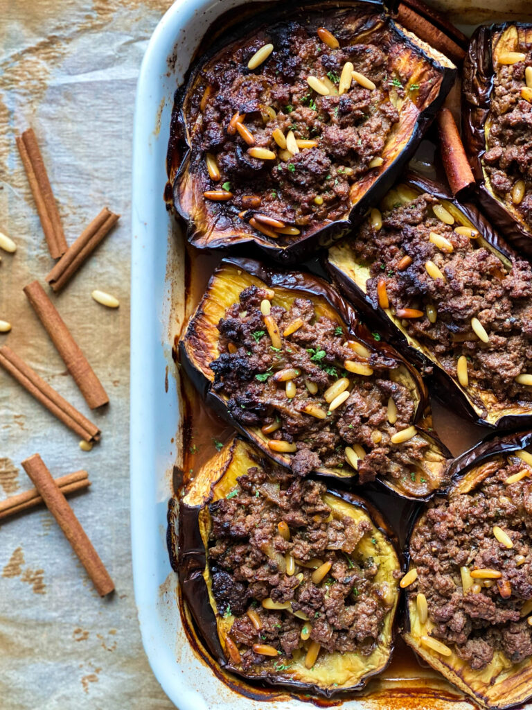 Disporre le melanzane in una teglia con il taglio rivolto verso l’alto. Spennellarle con 4 cucchiai di olio d’oliva, sale e pepe. Cuocere circa 20 minuti in forno a 220 °C. Scaldare 2 cucchiai di olio in una padella.  Mischiare tutte le spezie e versare la metà di questa miscela e le cipolle nella padella. Cuocere 8 minuti a fuoco medio. Unire macinato, pinoli, prezzemolo, concentrato di pomodoro, 1 cucchiaino di zucchero, sale e pepe e cuocere altri 8 minuti circa finché la carne non sarà cotta. Versare la restante miscela di spezie in una scodellina con 150 ml di acqua, succo di limone, pasta di tamarindo, 2 cucchiaini di zucchero, le stecche di cannella e mezzo cucchiaino di sale. Mischiare bene. Abbassare il forno a 195 °C.  Versare l’acqua speziata nella teglia con le melanzane. Distribuire il ripieno di carne sulle melanzane, coprire con un foglio d’alluminio e cuocere in forno un’ora e mezza finché le melanzane non saranno morbide e si sarà formata una salsa densa. Irrorare le melanzane con la salsa.