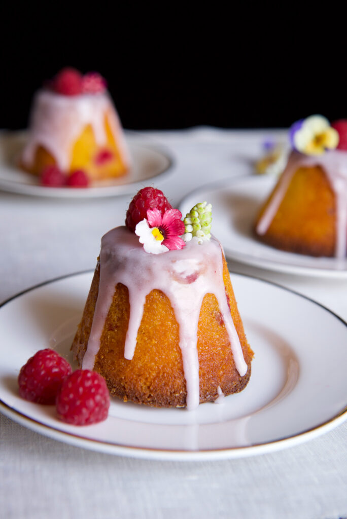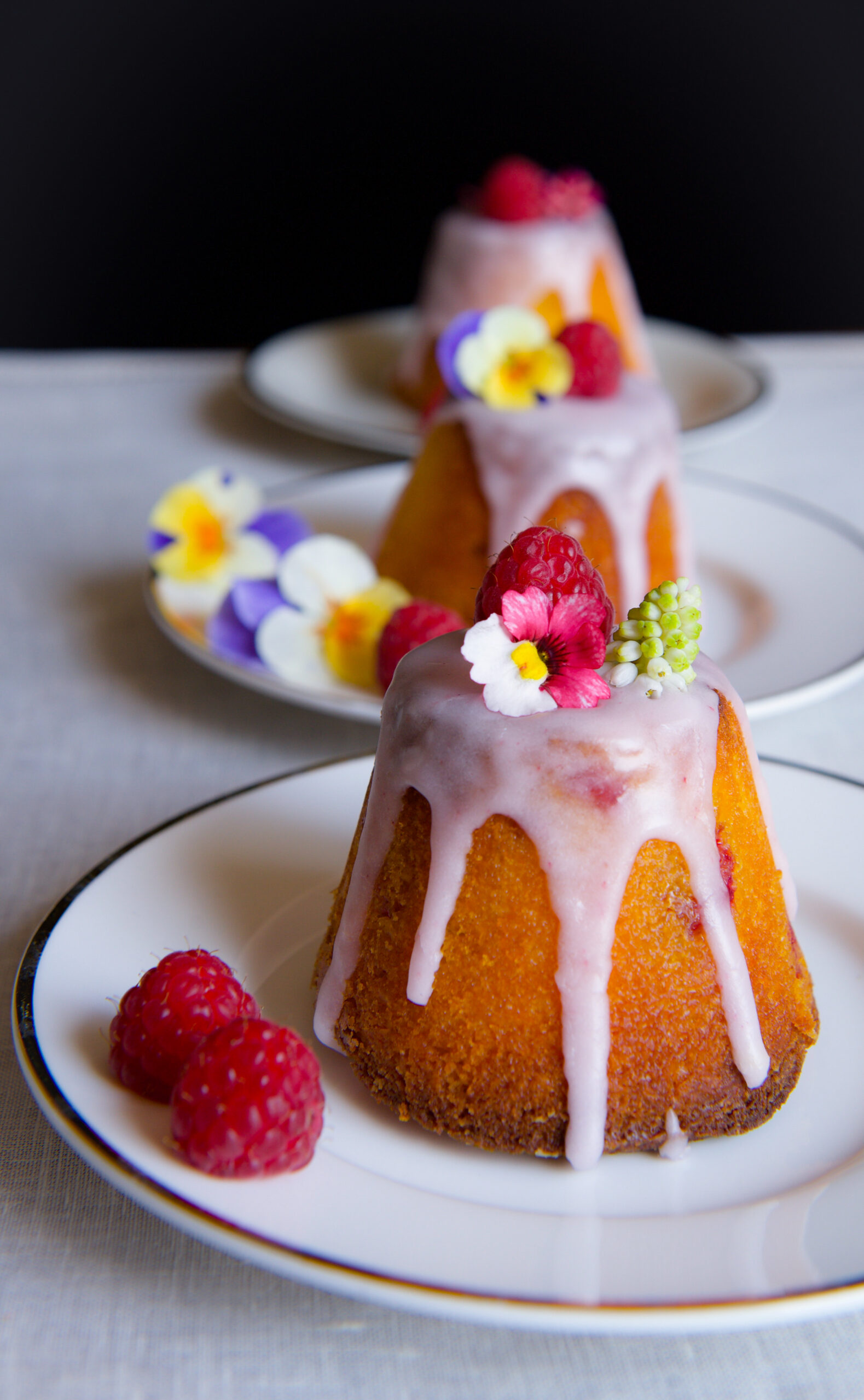 Preriscaldare il forno a 180 gradi.  Montare burro morbido, zucchero e limone finché saranno gonfi e spumosi.  Aggiungere le uova una alla volta sempre sbattendo.  Unire le due farine e il lievito.  In ultimo conservare i lamponi tenendone da parte 6 per la decorazione.  Versare il composto in 6 stampini da mini cake.  Cuocere 20/25 min circa facendo la prova stecchino.  Decorare a piacere con glassa.  lo l’ho fatta così: 70 gr di zucchero a velo con 1 cucchiaio di succo di limone e il succo di un lampone schiacciato senza semi.