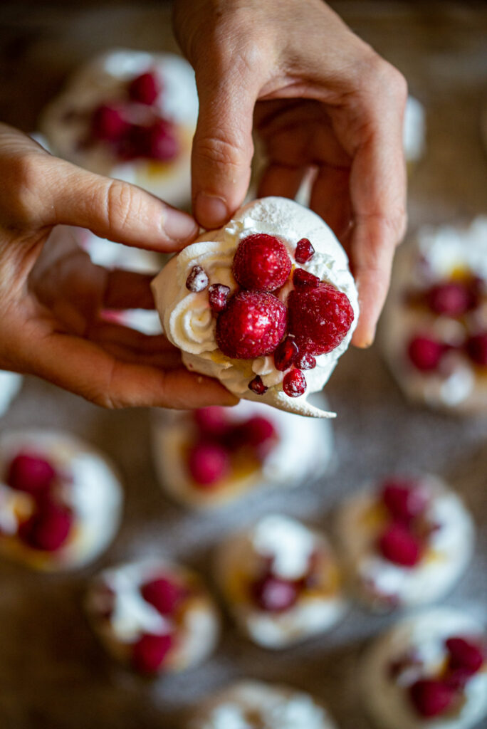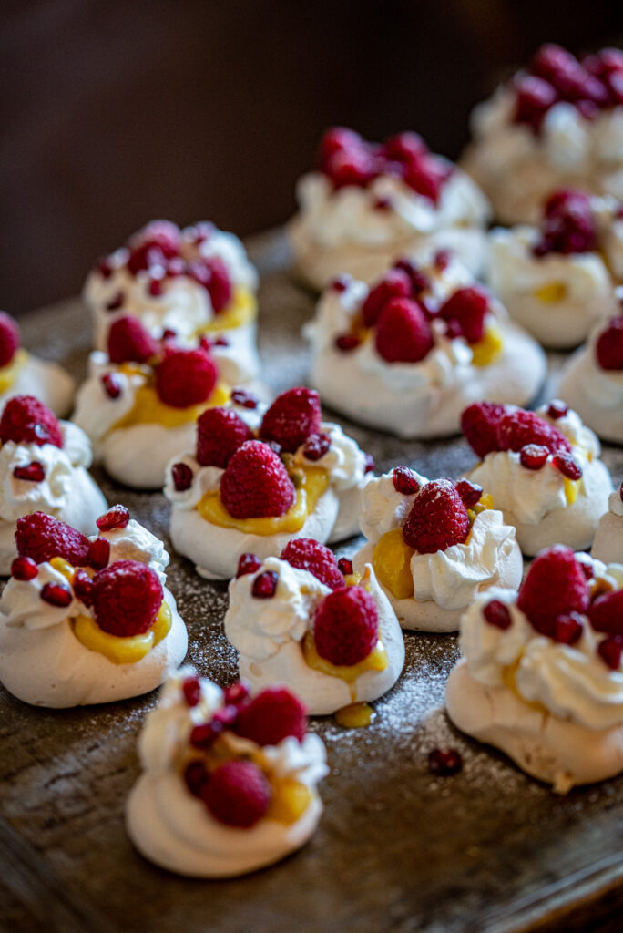 Se poi vogliamo arricchirla con un ripieno ancor più goloso basta appoggiare sulla mini pavlova un cucchiaino di voluttuoso lemon curd (o come lo chiama Maurizio Santin cremoso al limone) e poi ciuffi di panna, frutto della passione e qualche lampone. Non dimentichiamo che i chicchi di melagrana portano sempre tanta fortuna.
