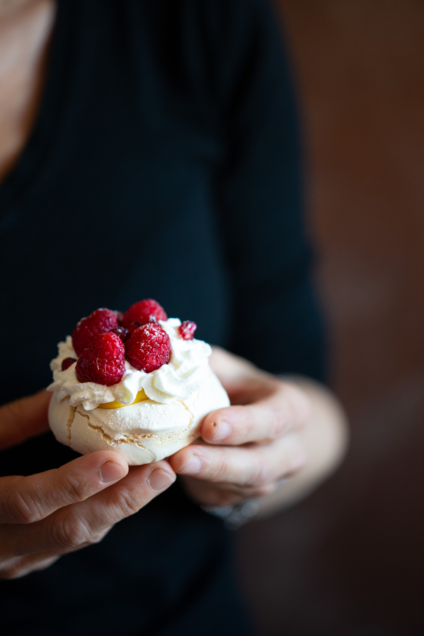 Se poi vogliamo arricchirla con un ripieno ancor più goloso basta appoggiare sulla mini pavlova un cucchiaino di voluttuoso lemon curd (o come lo chiama Maurizio Santin cremoso al limone) e poi ciuffi di panna, frutto della passione e qualche lampone. Non dimentichiamo che i chicchi di melagrana portano sempre tanta fortuna.