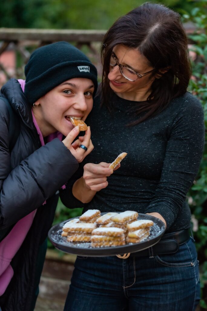 Io ho impastato tutti gli ingredienti, ho formato dei filoni e tagliato i biscotti con una rotella formando dei bastoncini. Ho cotto a 170 gradi fino a doratura e, una volta freddi, li ho cosparsi di zucchero a velo.