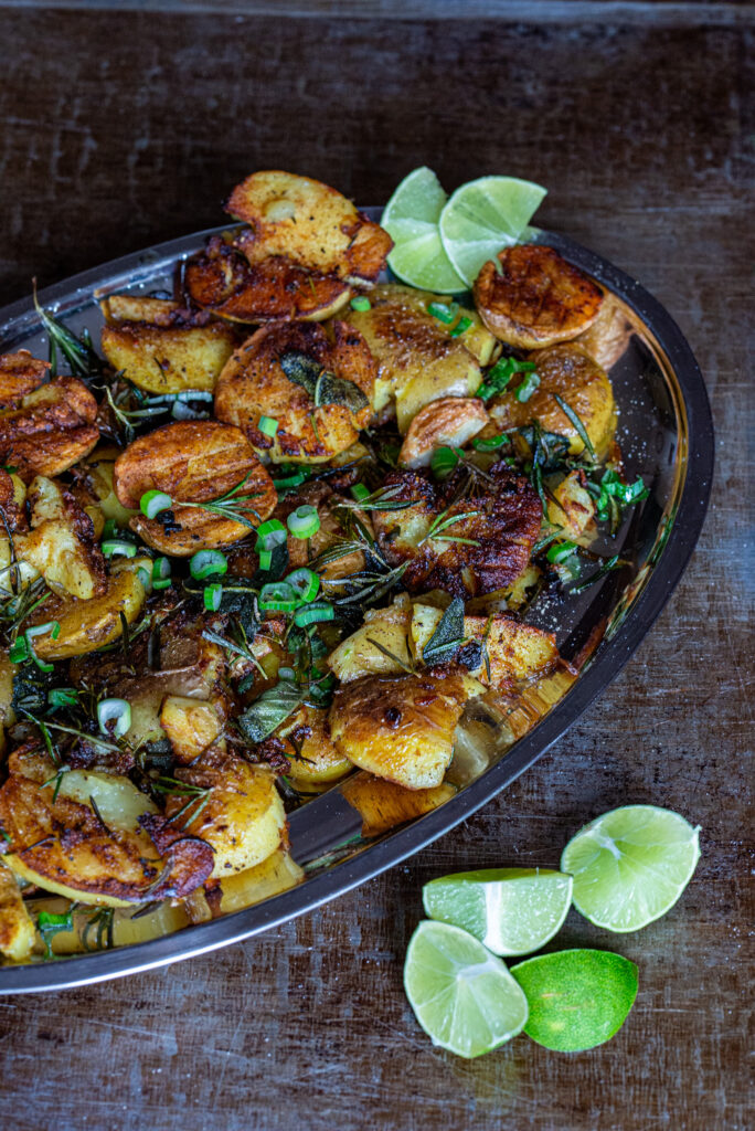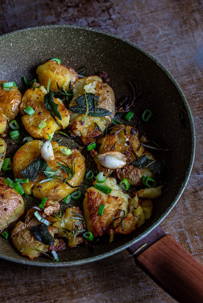Oggi vi racconto una ricetta facile e infallibile per portare in tavola delle patate davvero speciali! Le ho schiacciate, insaporite con erbe profumatissime, spezie e abbondante pepe nero macinato al momento. E poi rese croccanti in padella e servite a tavola con cipollotto fresco e una spruzzata di limone.