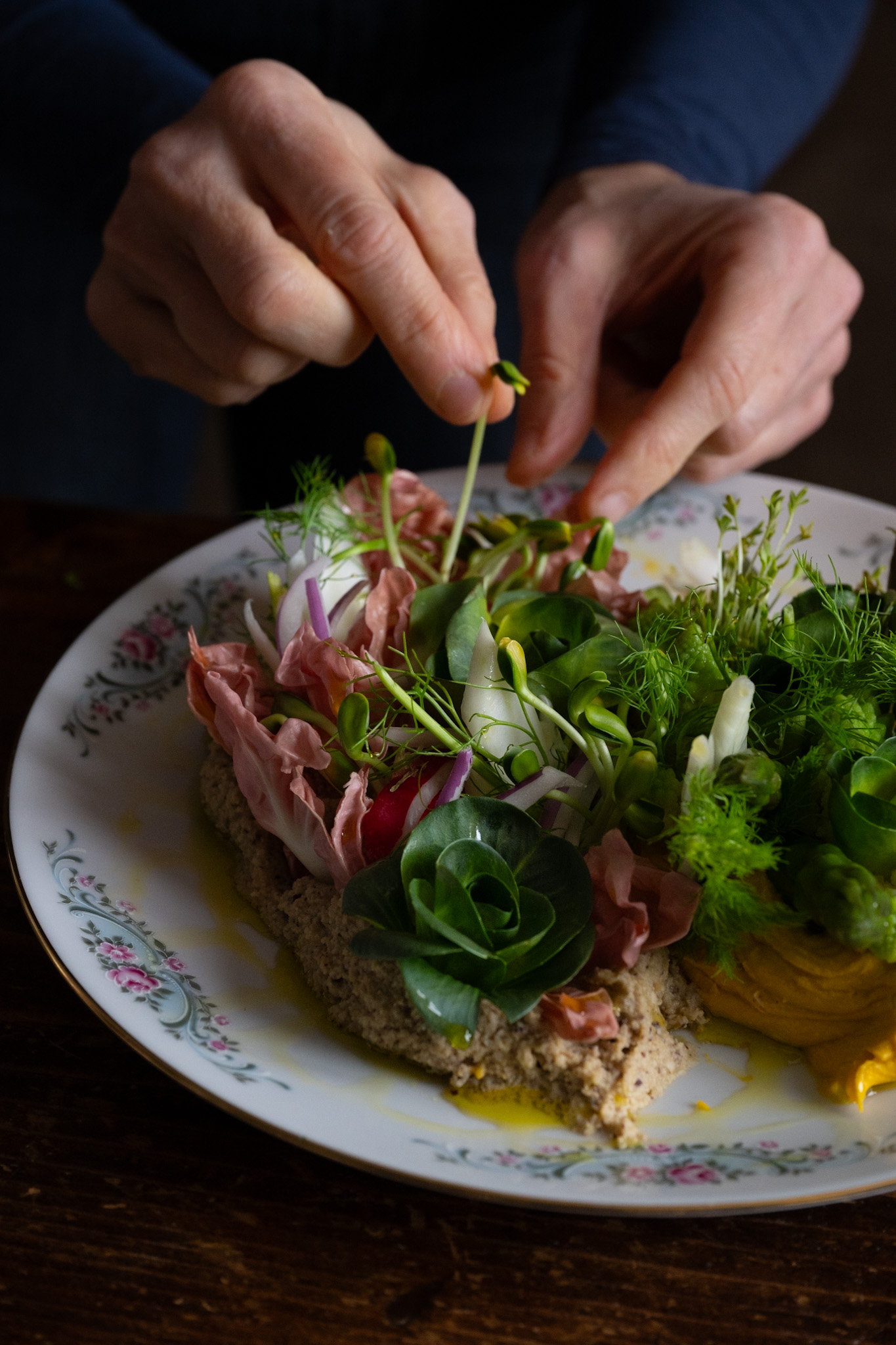 Un Paté delizioso, un hummus dal colore ipnotico e una varietà di ortaggi di stagione compongono questo piatto colorato e primaverile. La creatività è l’elemento chiave, sia nella preparazione delle salse che nella composizione delle verdure.