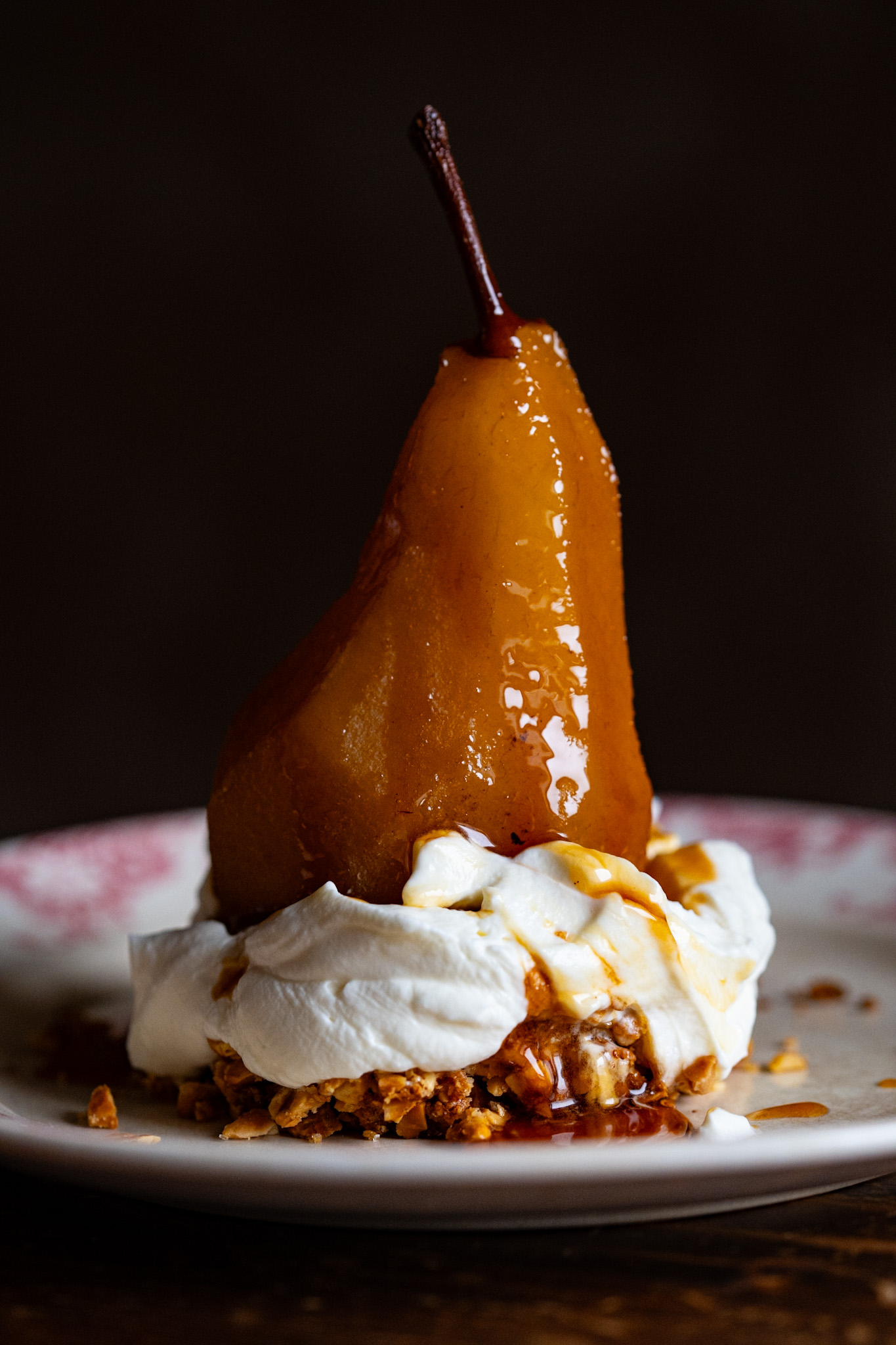 Una pera cotta nel Marsala con spezie e aromi, un crumble burroso alle nocciole, uno spuntone di creamcheese. Un dolce semplice e voluttuoso, facile da assemblare e perfetto per qualsiasi occasione, anche la più raffinata.