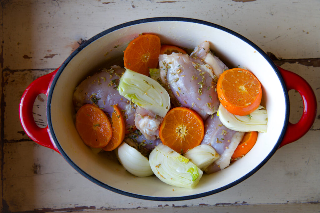 Tagliare in 8 parti i finocchi e a rondelle le clementine lasciando la buccia. Mescolare il liquore con l’olio, i succhi degli agrumi, la senape, lo zucchero, il timo, i semi di finocchio e 2 cucchiaini di sale. Aggiungere il pollo a pezzi, i finocchi e le clementine affettate, mescolare con le mani per distribuire bene il condimento e lasciare marinare in qualche frigorifero qualche ora o la notte. Accendere il forno e portarlo a 200°c, versare il tutto in una teglia e cuocere finché il pollo sarà dorato, le verdure leggermente caramellate e i succhi ritirati e un po’ densi. Tritare il prezzemolo e versarlo sul pollo prima di servirlo.