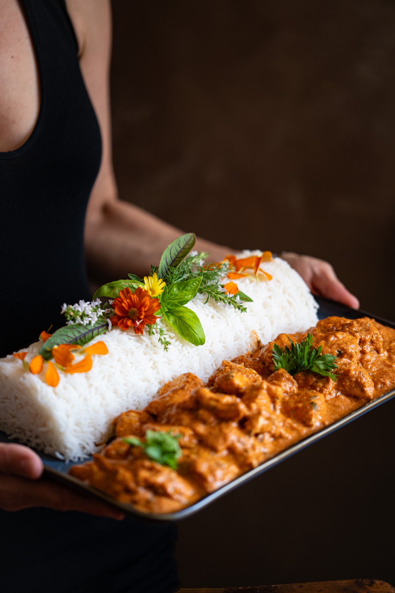 Nel frattempo che il pollo cuoce preparate la salsa: mettete in una casseruola con poco olio di semi ( o ghee) 2 cm di zenzero fresco tritato e mezza cipolla tritata e fate ammorbidire. Aggiungete 2 cucchiaini di garam masala ( io ne ho messi 3 perché adoro questa spezia) e unite due barattoli di salsa di pomodoro, cuocete finché la salsa di addensa. A fine cottura unire 150 gr di panna da cucina e infine aggiungere il pollo facendolo insaporire nella salsa. Cuocere ancora qualche minuto, ultimare il piatto con coriandolo fresco tritato (oppure prezzemolo) e servire con riso basmati…