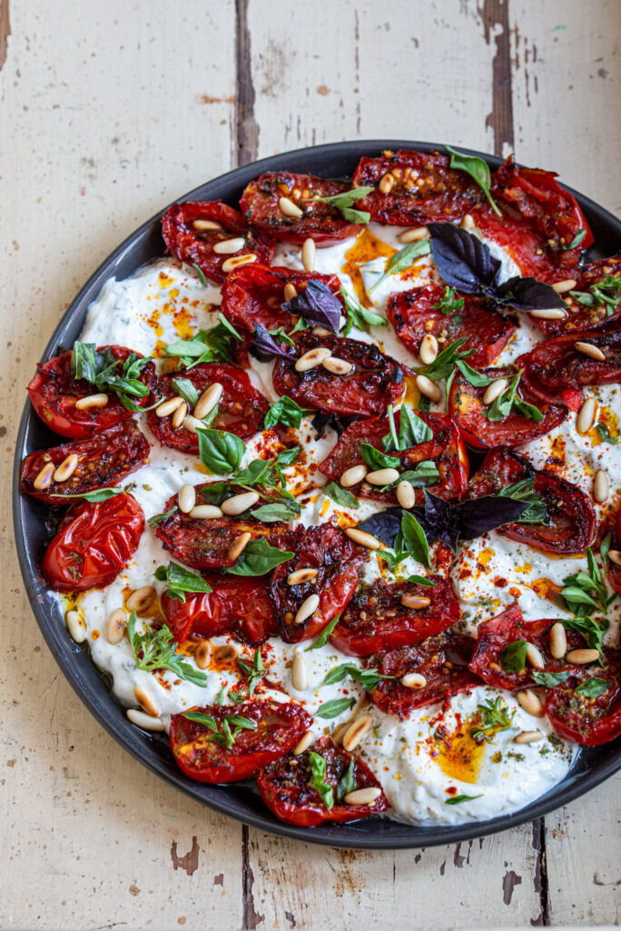 sul fondo distribuisci qualche cucchiaiata di yogurt, disponi negli spazi i pomodori, condisci lo yogurt con l’olio all’harissa, guarnisci con tante foglioline di basilico fresco e una bella manciata di pinoli tostati. Prepara dei crostini di buon pane e servi in tavola.