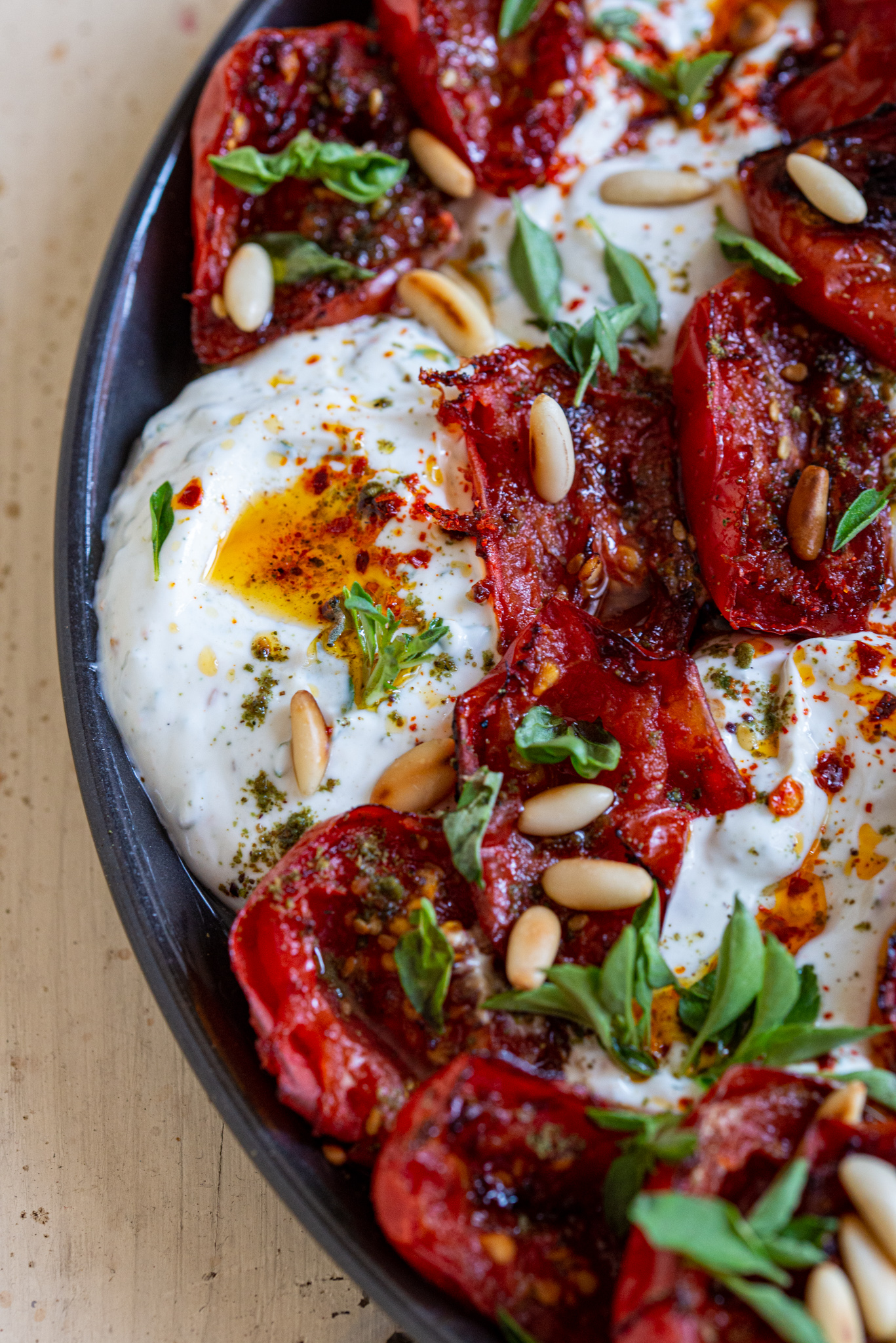 sul fondo distribuisci qualche cucchiaiata di yogurt, disponi negli spazi i pomodori, condisci lo yogurt con l’olio all’harissa, guarnisci con tante foglioline di basilico fresco e una bella manciata di pinoli tostati. Prepara dei crostini di buon pane e servi in tavola.
