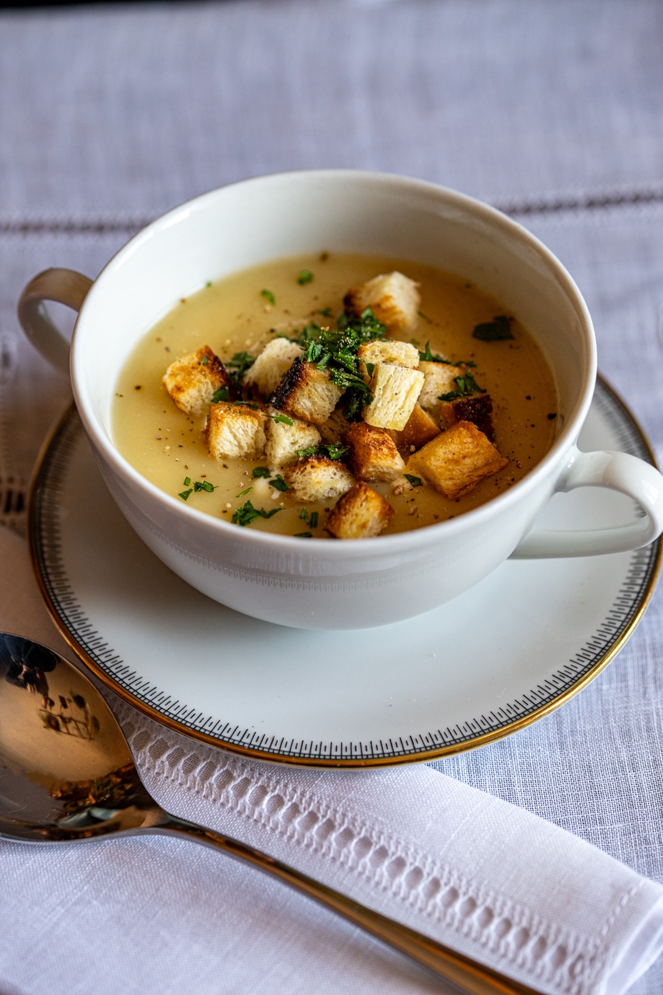 Il “Potage parmentier” è una zuppa di patate e porri così cremosa che conquista con la sua raffinatezza e il suo sapore delicato.