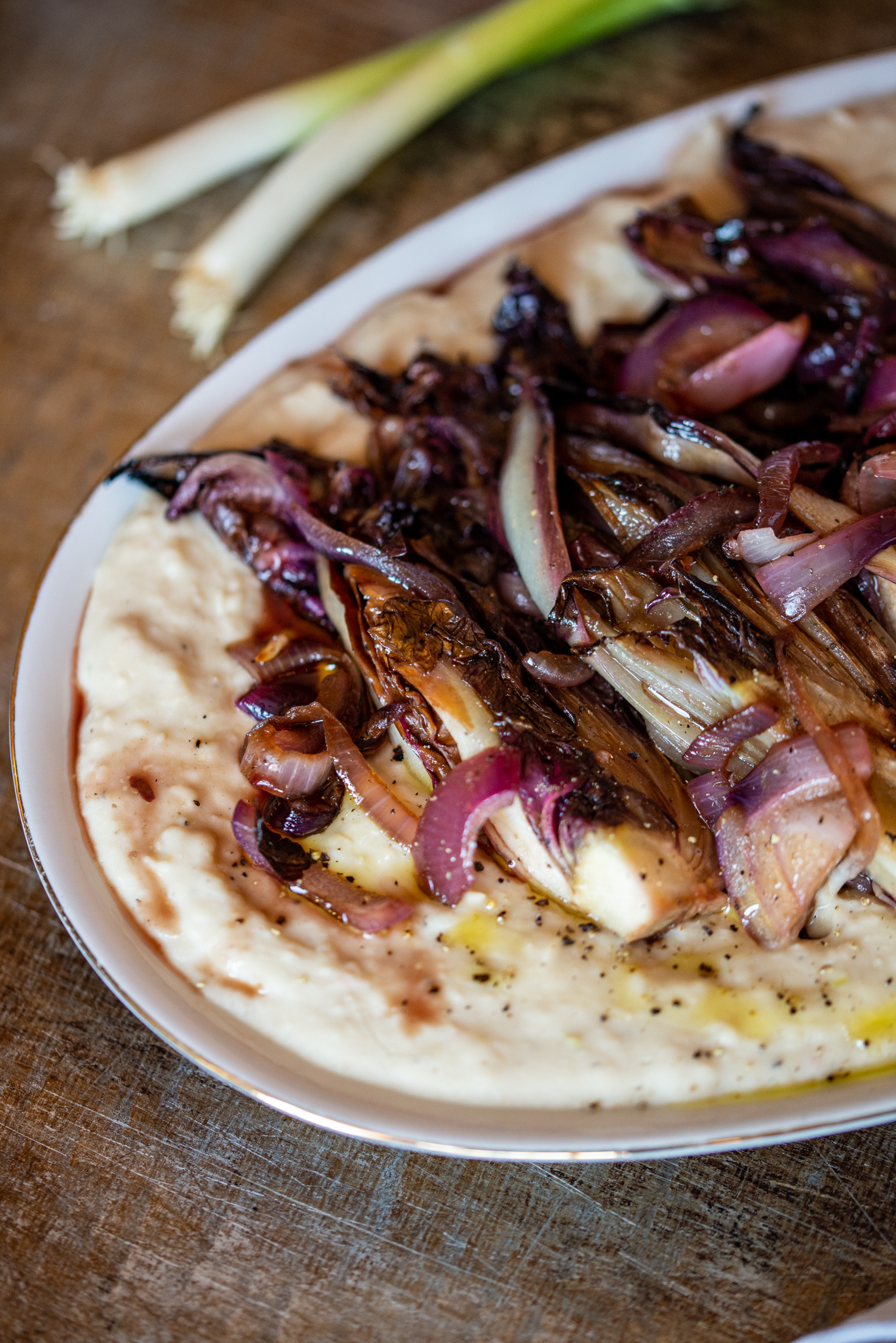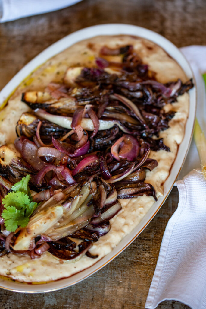 Oggi avevo a disposizione i fagioli cannellini che hanno quel sapore un po’ terroso che si sposa a meraviglia con le foglie amarognole del radicchio. Ma l’ho provata praticamente con tutti i legumi e sta benissimo anche con le lenticchie, con i fagioli borlotti e pure con i ceci. Diciamo che visivamente i cannellini sono perfetti perché fanno risaltare le foglie bruciacchiate del trevisano.