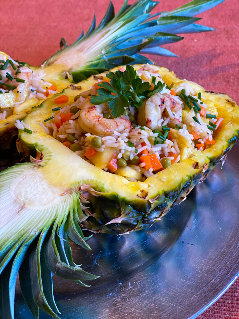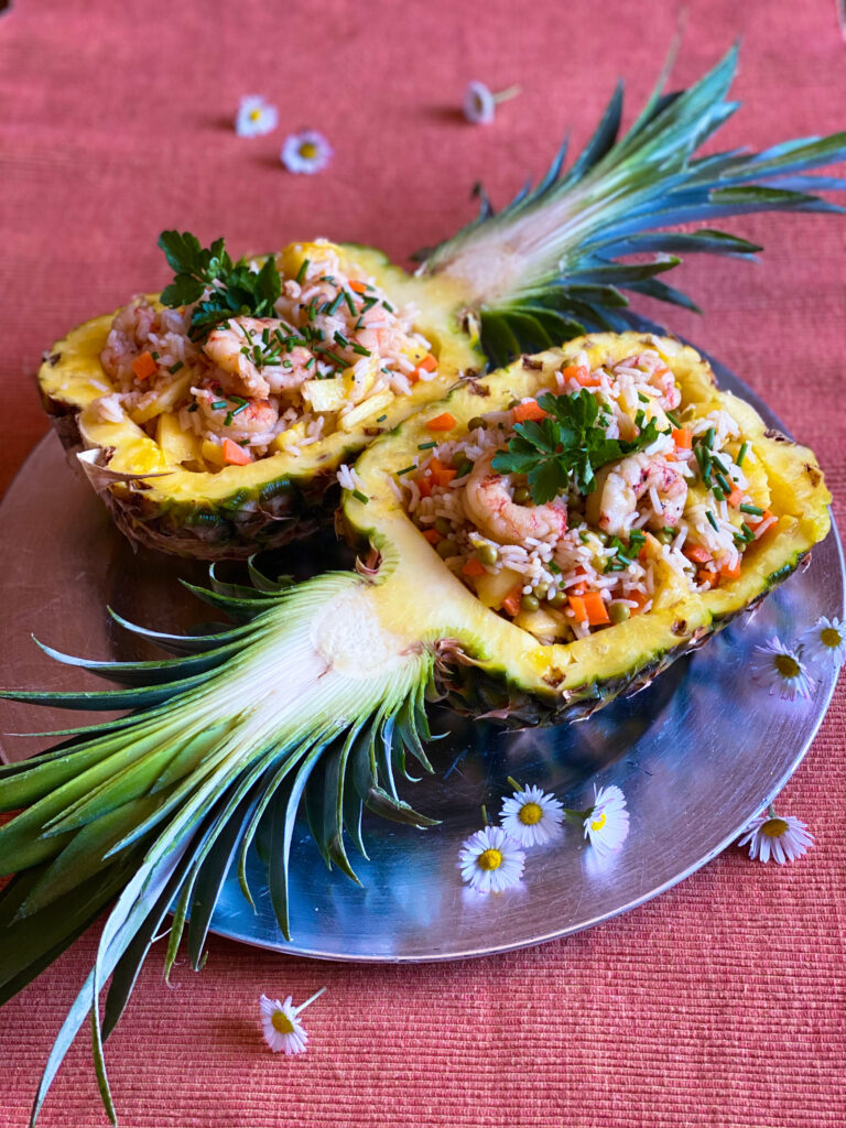 Tagliare a metà l’ananas e scavarlo. Tagliare in piccoli pezzi la polpa di mezzo ananas e mettere da parte. Bollire il riso e farlo raffreddare. Cuocere i piselli e mettere da parte. In una padella mettere un filo d’olio con uno spicchio di aglio schiacciato, versare i gamberi e sfumare con il cognac. Aggiungere i germogli e la carota tagliata in piccoli pezzi e cuocere poco le verdure lasciandole croccanti. Unire il riso, l’ananas e i piselli, aggiustare di sale e di pepe e condire con salsa di soia. Guarnire con erba cipollina. Versare tutto nell’ananas scavato e gustare. Buon appetito!