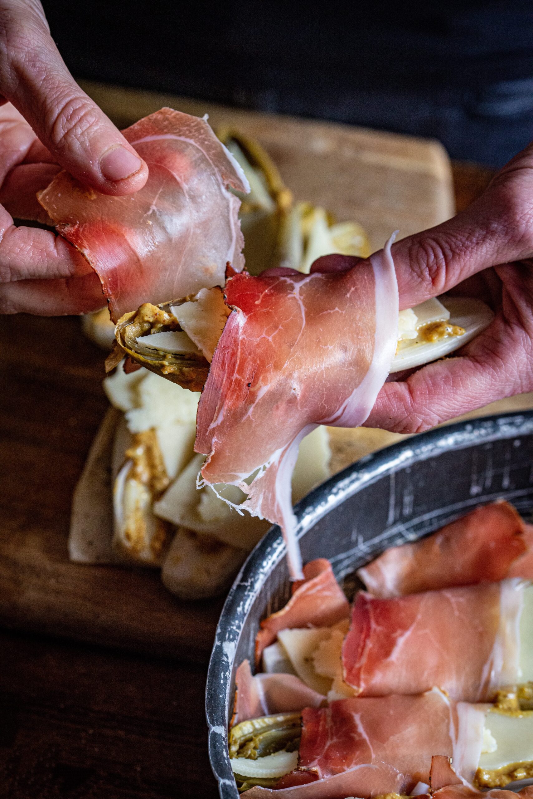 Ho spalmato mezzo cucchiaino di senape su ogni barchetta di indivia, ho appoggiato un piccolo pezzo di formaggio emmental e ho avvolto tutto nella sottile fetta di speck.