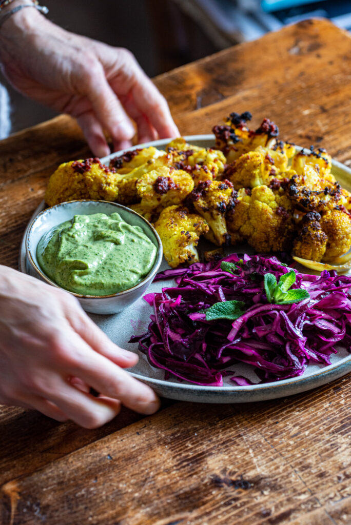 Componi il piatto mettendo il Shawarma di cavolfiore, il cavolo cappuccio condito con un filo di olio e qualche foglia di menta e accompagna tutto con la tahina verde.
