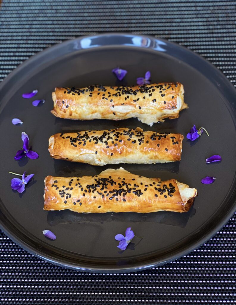 Sigara Börek Peynir Sigari al formaggio feta da “Persiana” di Sabrina Ghayour Olio d'oliva 200 g di formaggio feta 2 cucchiaini di menta secca (io fresca) 1 cucchiaio di yogurt greco intero 6 fogli (1 confezione) di pasta fillo 3 uova grandi Semi di nigella o sesamo nero per decorare